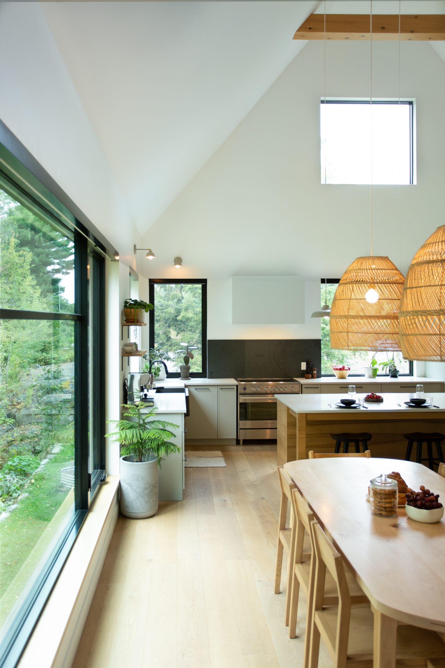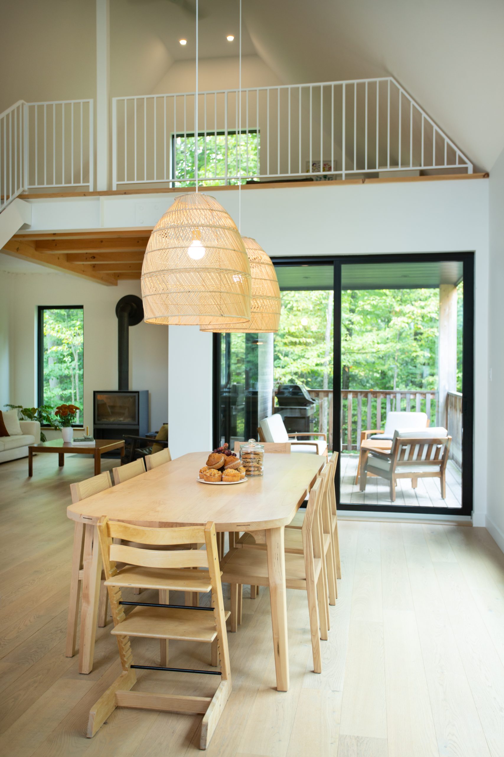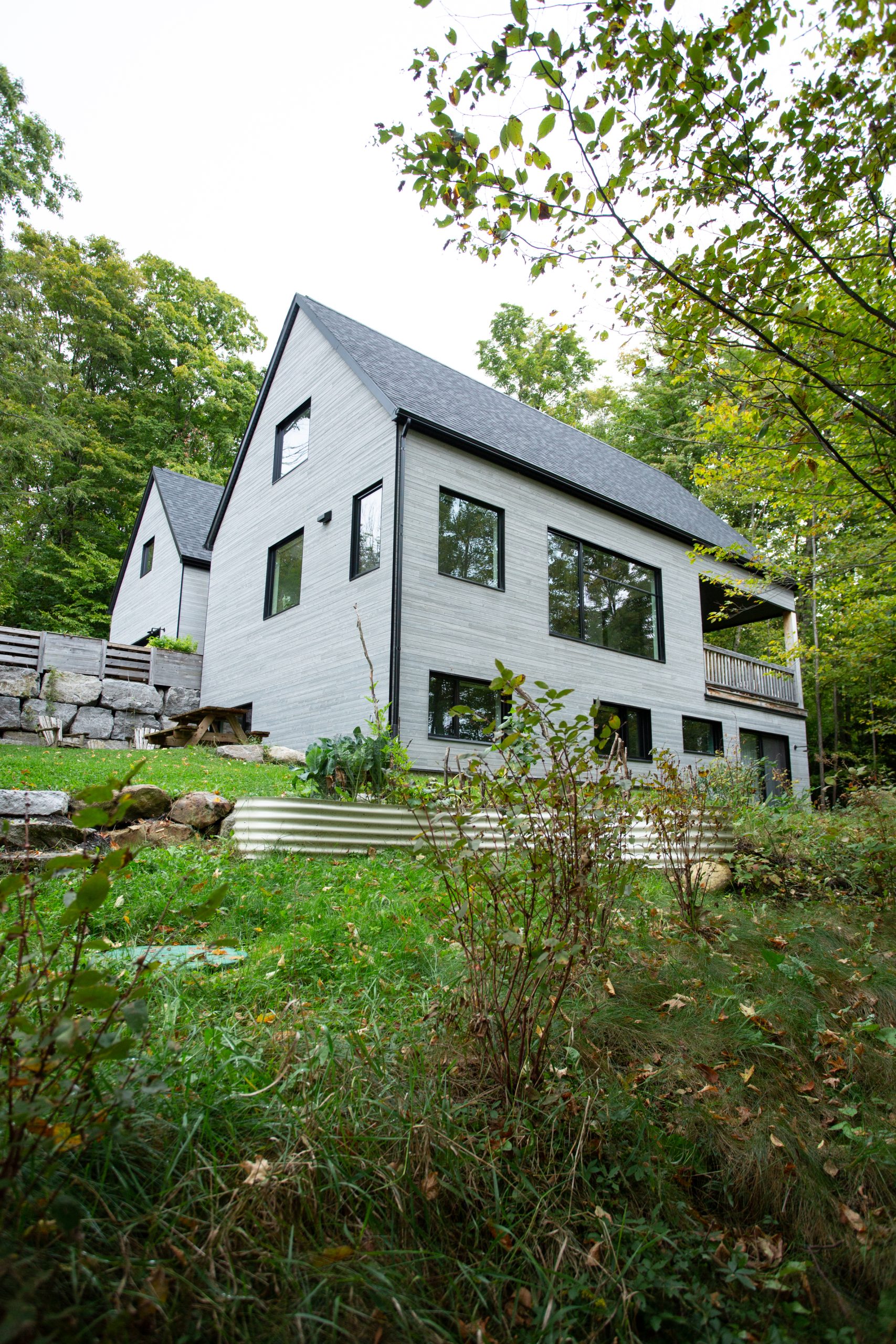 The Blais-Monfette home is thoughtfully designed to perfectly suit the lifestyle of its occupants. With its timeless elegance, this residence harmoniously blends into its natural surroundings, offering a seamless connection to the outdoors. The active Blais-Monfette family enjoys daily access to nature’s finest amenities on their property, including a chicken coop, outdoor shower, flourishing gardens, a spacious terrace, and a cozy fire pit.