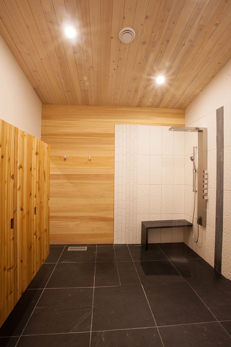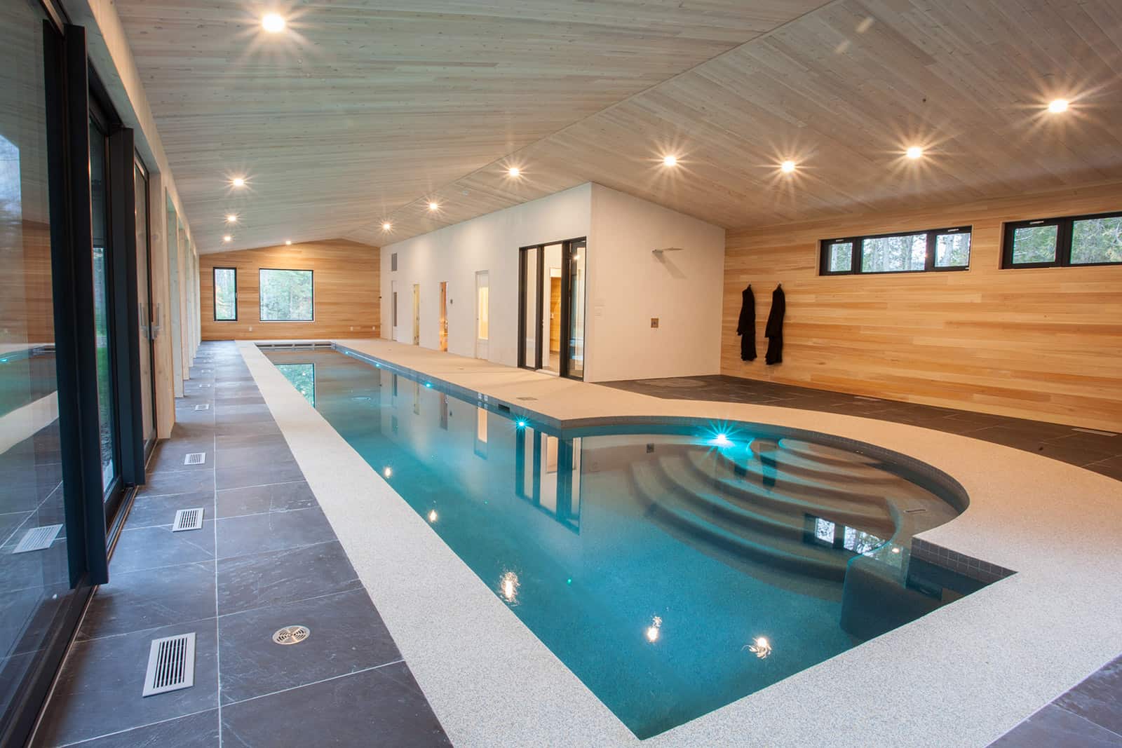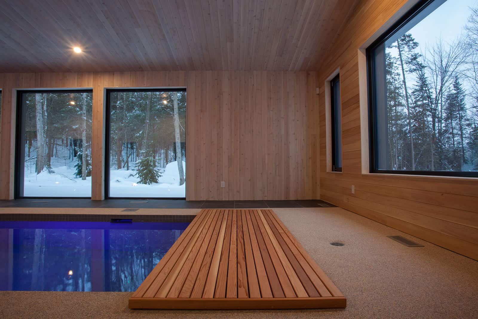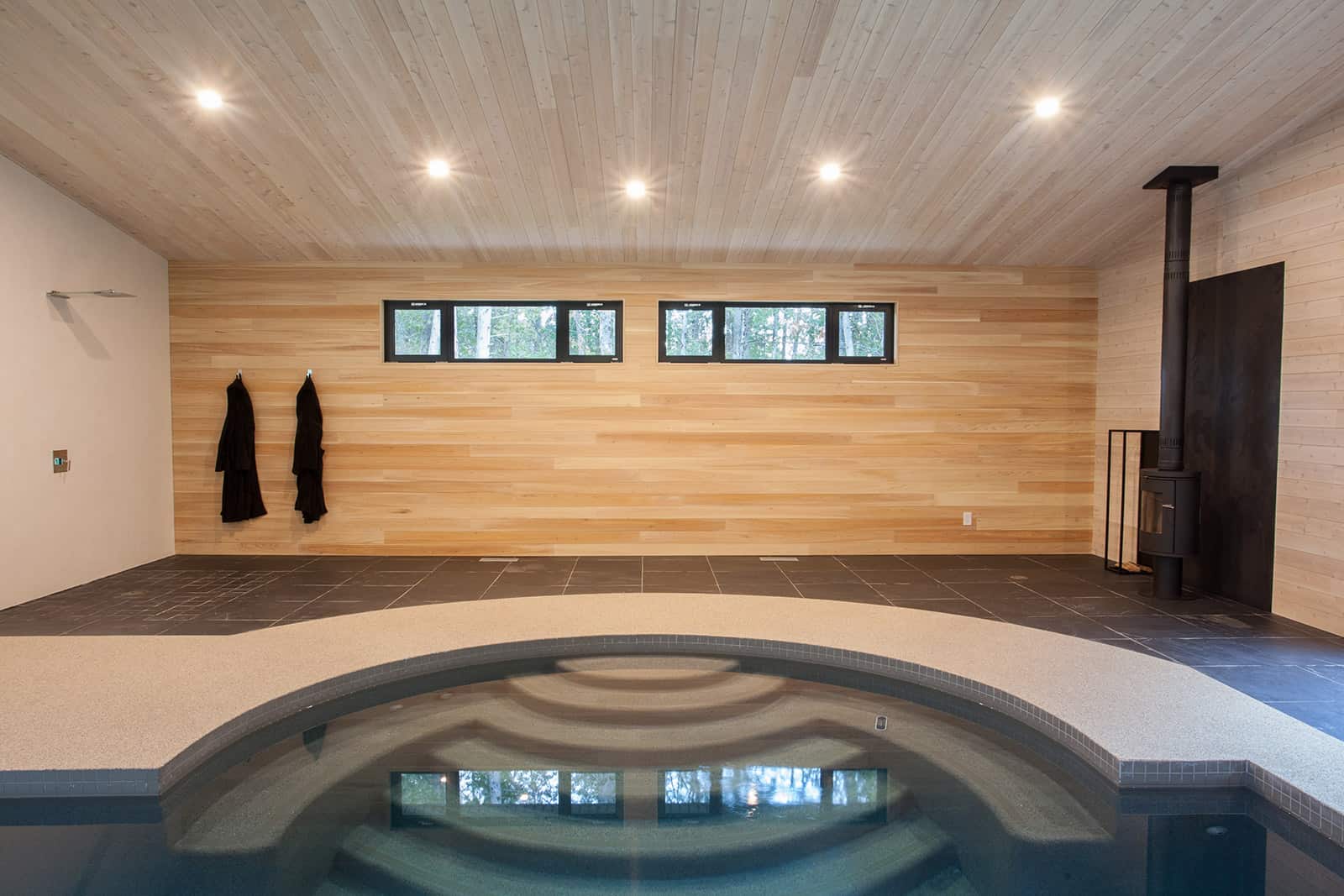 Designed and delivered in just six months to an American couple who recently relocated to Canada, La Pool is at the cutting edge of technology in terms of low-energy indoor pools. This private indoor complex also houses a sauna, hammam (steam room) and a relaxation area with a wood burning stove. Many high-end technical elements that contribute to make this place an oasis of peace and relaxation have been chosen since they are healthy for the body and the environment. Air quality is ensured by efficient ventilation, automated humidity control and Cedar finishing and lime coatings have been chosen for their natural antifungal properties and great beauty. An LED lighting system creates soothing lighting ambiances and the high quality of materials, the choice of textures and colors, coupled with a welcoming and pure design are conducive to contemplation.