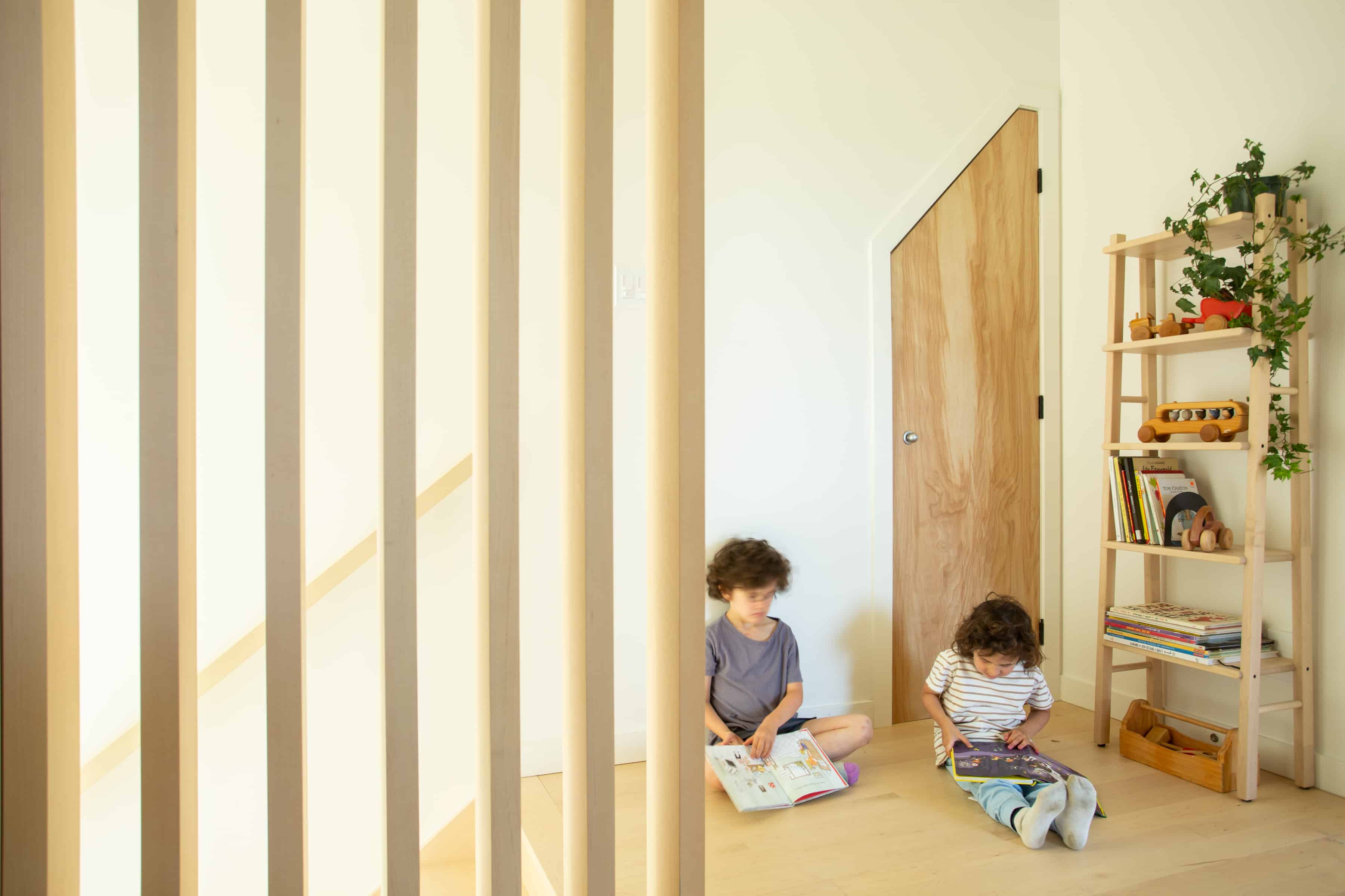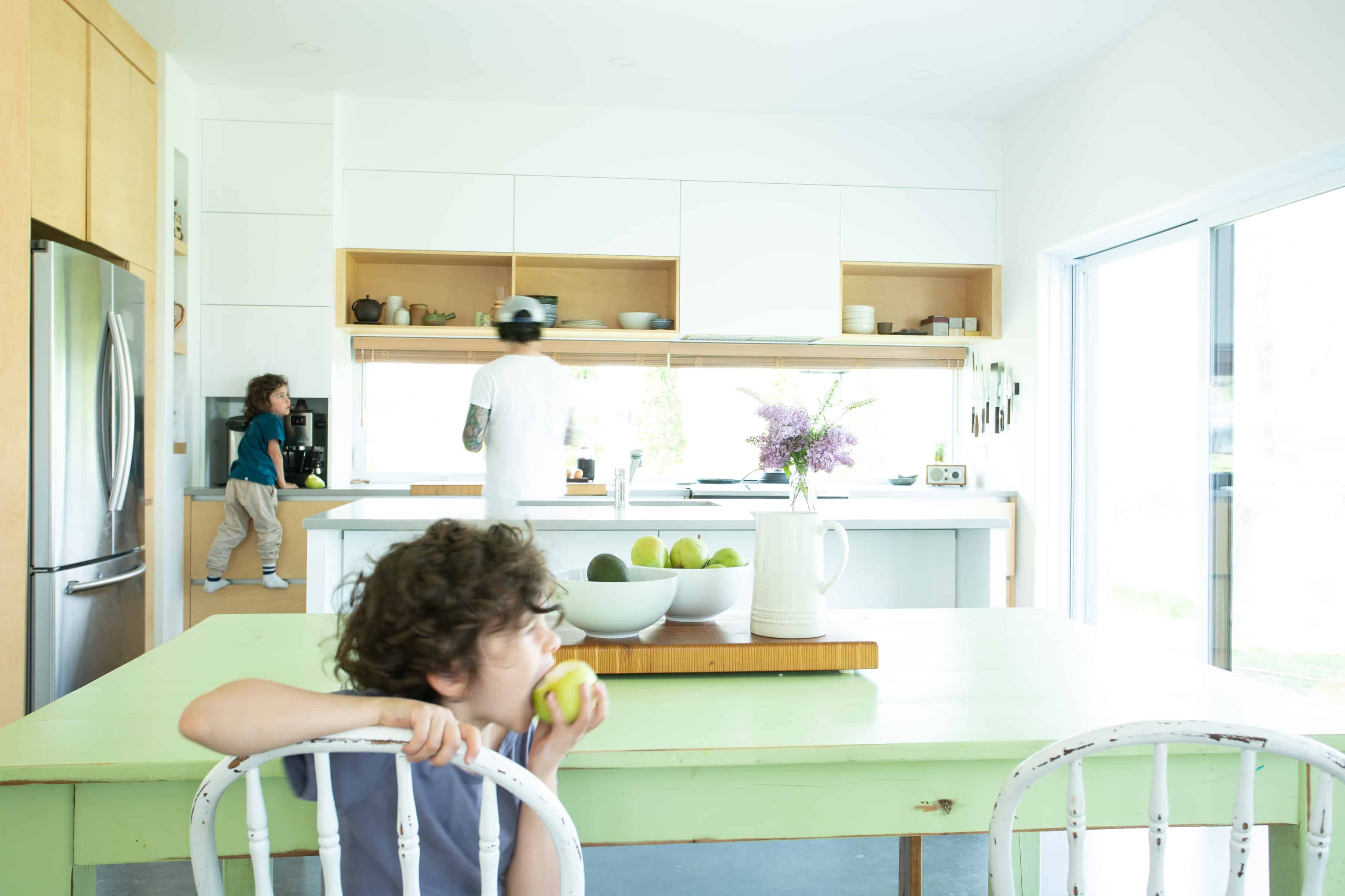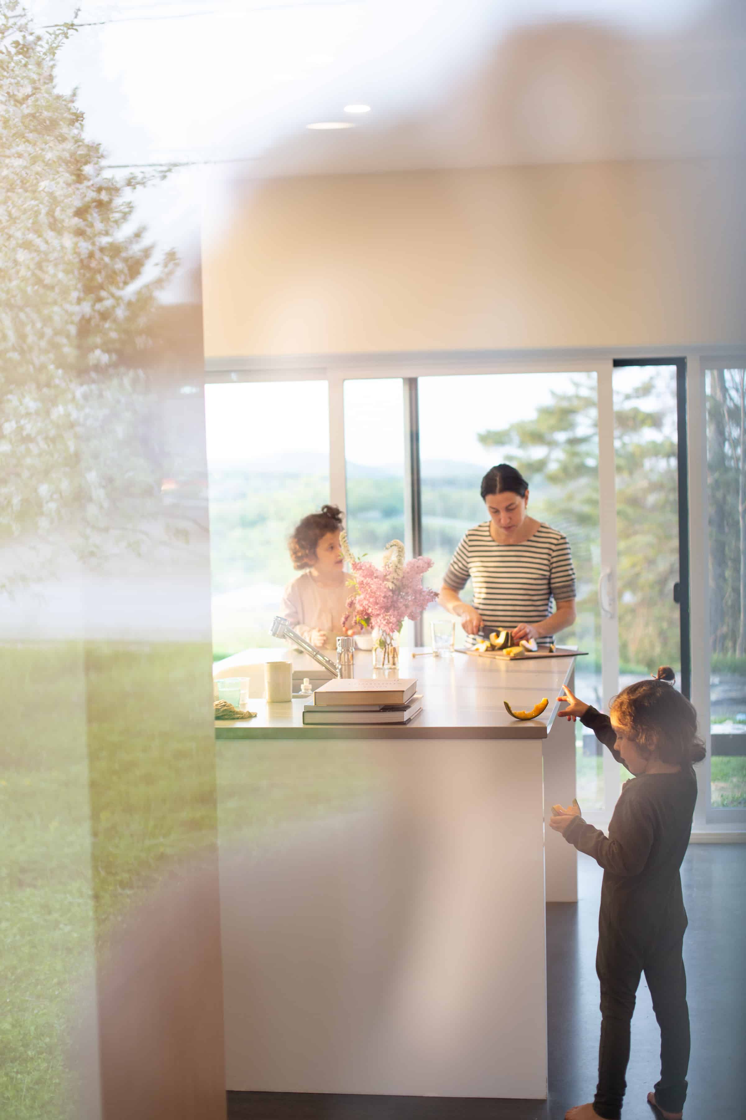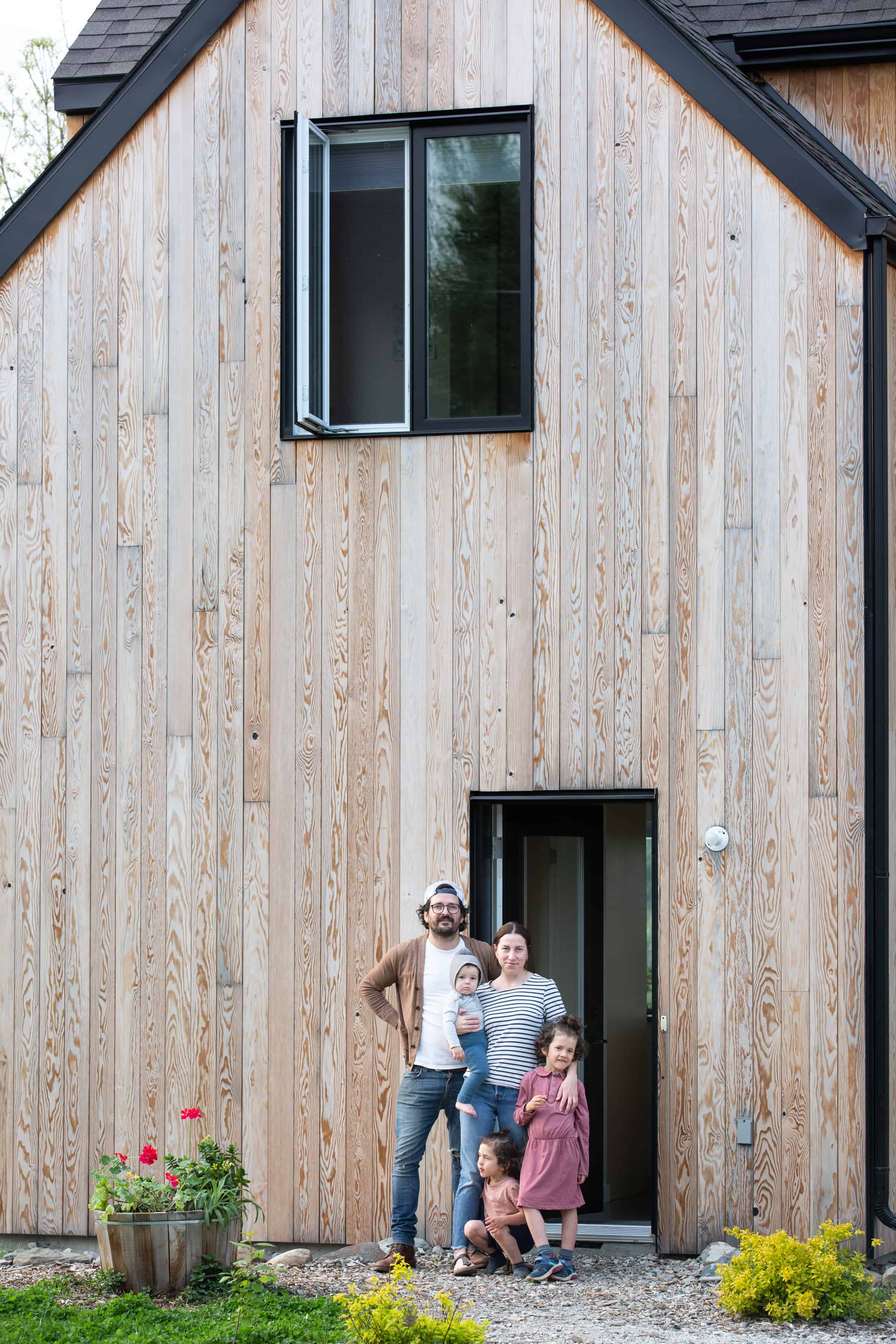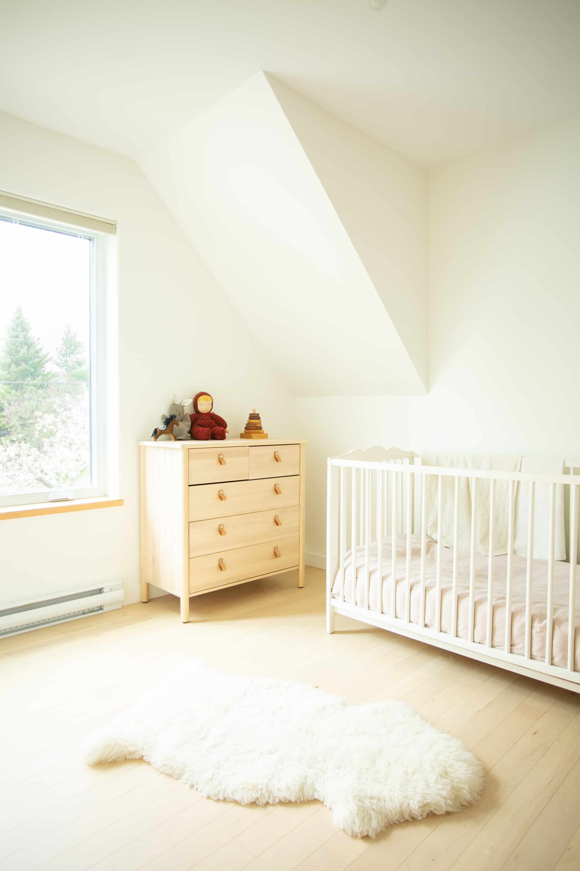 Welcome to the Lacroix-Durocher family cocoon, a LEED certified house for a family of five. As the owners were working in northern Quebec during the design process, trust and communication were essential to create their dream home remotely. Built with care, the location of the house is ideal to frame the magnificent sunset from the inside and preserve the apple tree close by, all within the spirit of disturbing the land to a minimum. The two floors of the house fit three bedrooms, two bathrooms and a heated concrete floor to suit the little one, walking on all fours. Built with noble materials and inspired from the minimalist and Scandinavian architectural styles, the staircase railings were designed and built to perfectly suit the atmosphere of this cozy nest.
