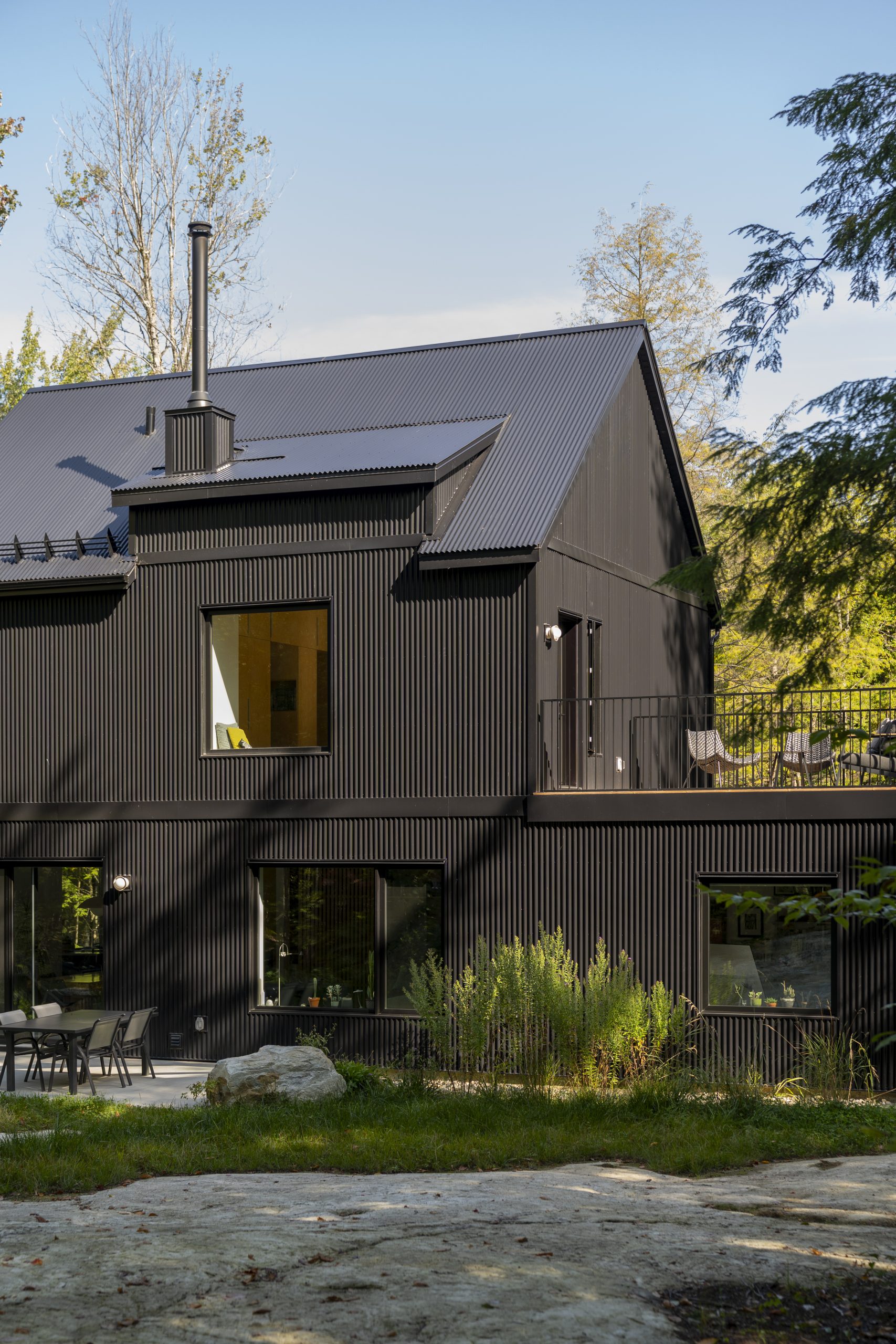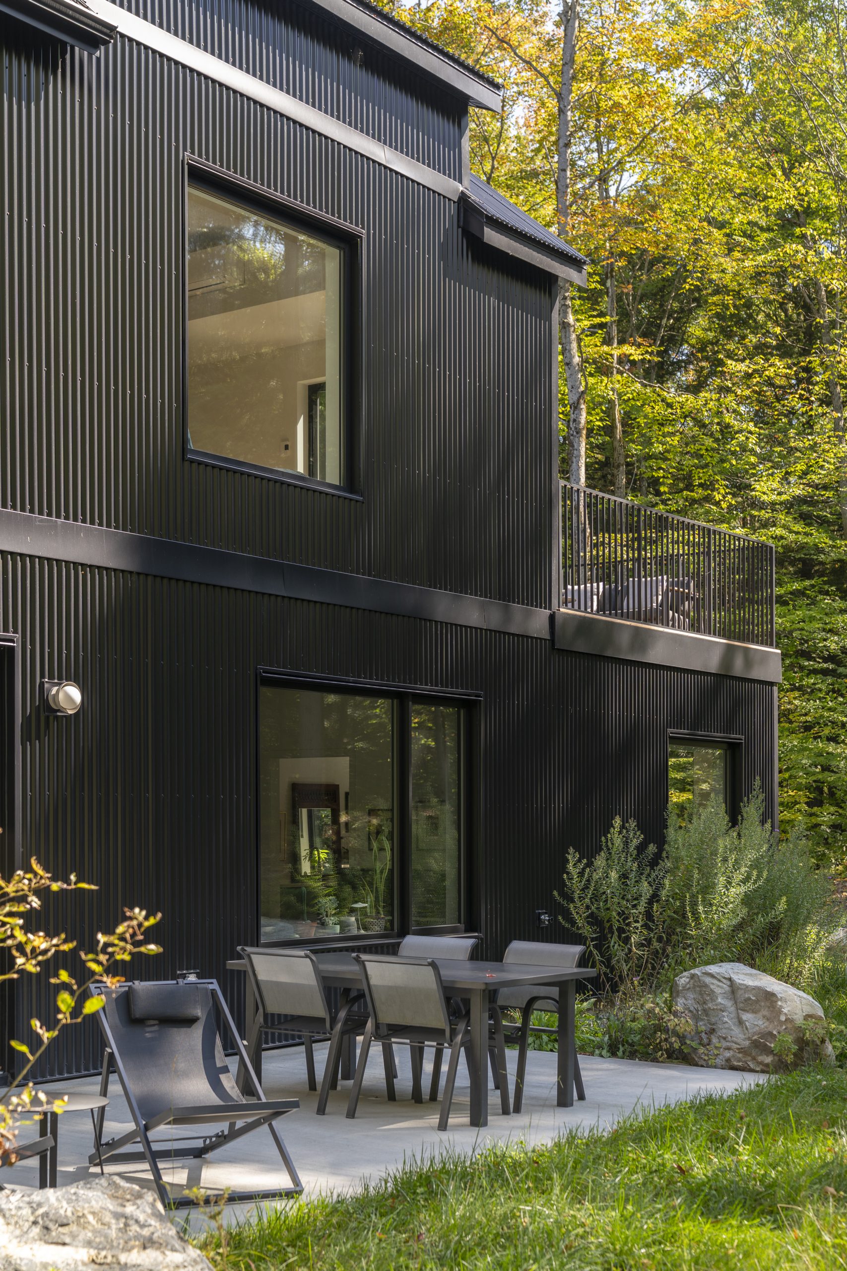The home was designed for a retired couple seeking a comfortable day-to-day living environment while still being able to welcome their two sons during visits. The interior layout therefore focuses on adaptability and space optimization : home offices can be converted into guest bedrooms thanks to Murphy beds, while the living room can be reconfigured either to take in the surrounding landscape in front of the wood-burning stove or to host movie nights. In addition, all storage in the house was custom-designed, eliminating any wasted space. In total, the house includes three bedrooms, an open-concept main floor, a multifunctional room on the second floor, one powder room, and one full bathroom.