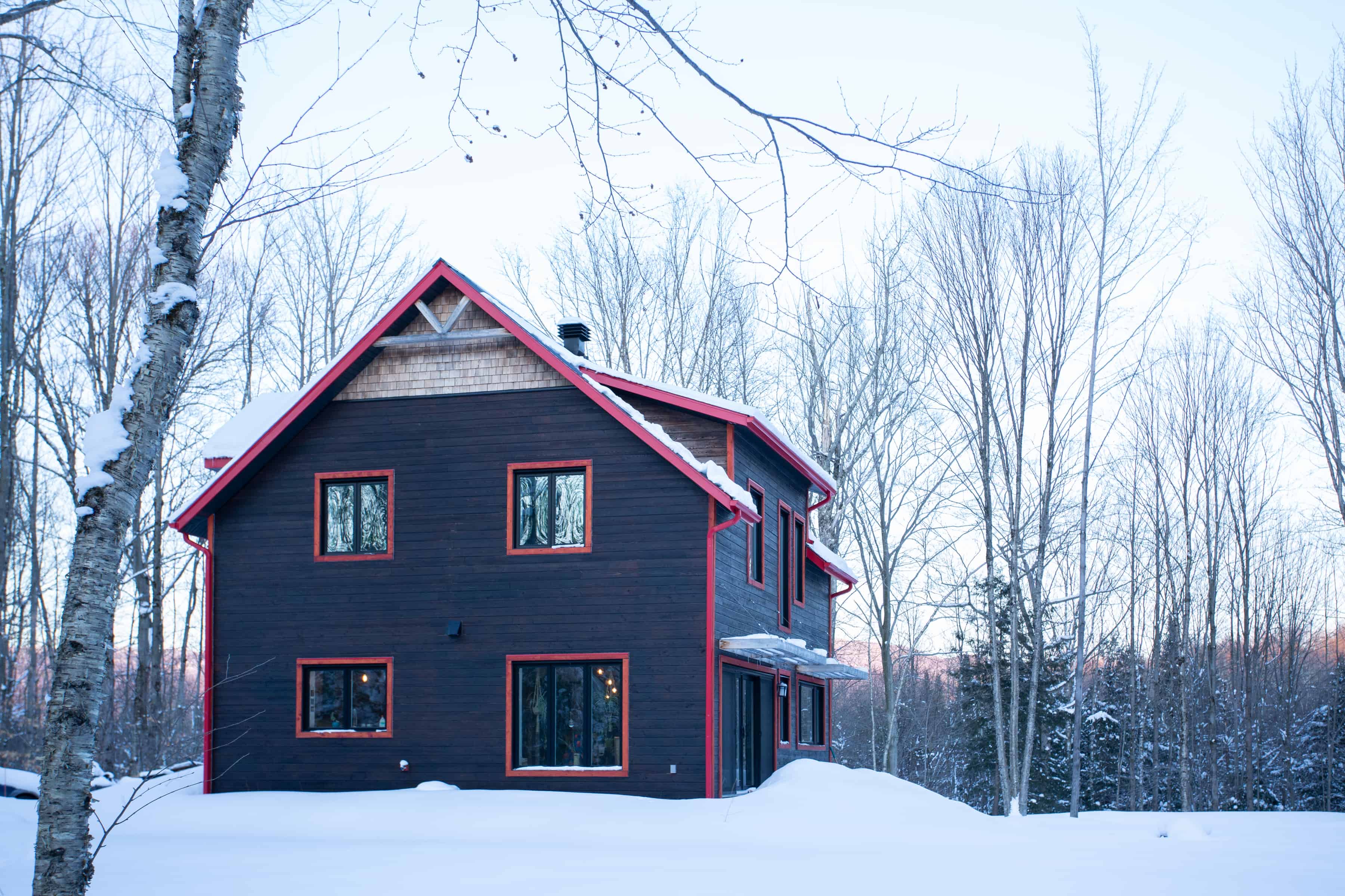 Surrounded by a forest in Eastman, this healthy and eco friendly home accomodates a family of four with three bedrooms. The new home owners personnalized the design with a touch of red on the outside, combined with cedarwood and tin roofing. Inside, the stairsmade of steel add a modern touch, balanced with wood for a warmer look.