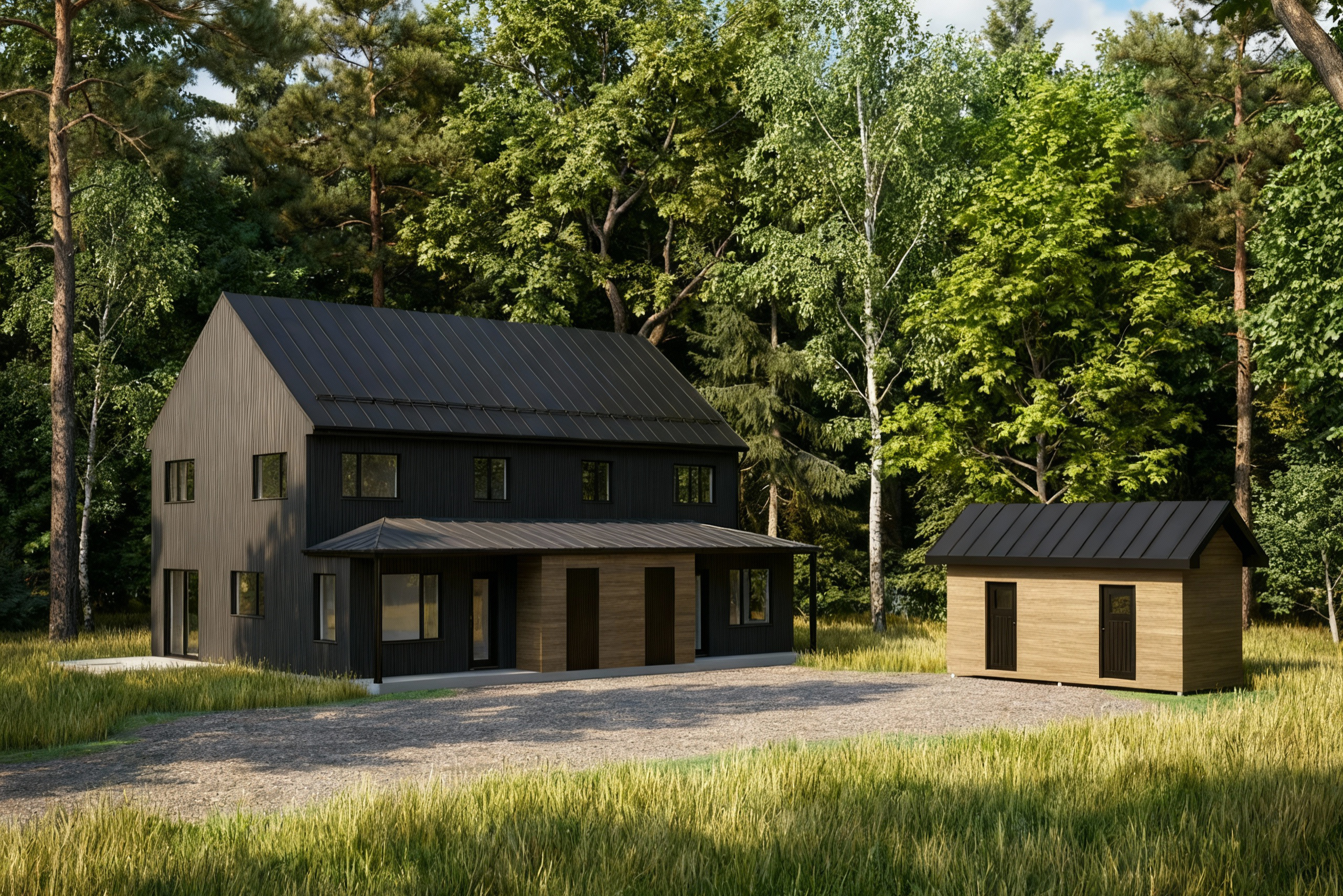 - Toiture de tôle, revêtement en épinette prépeinte