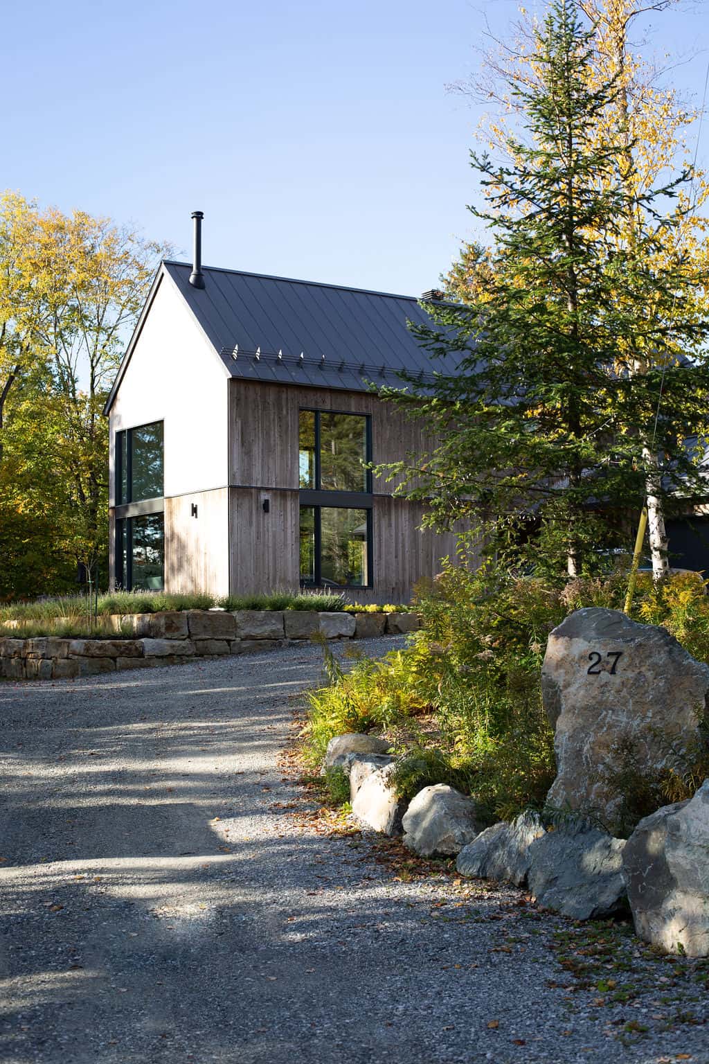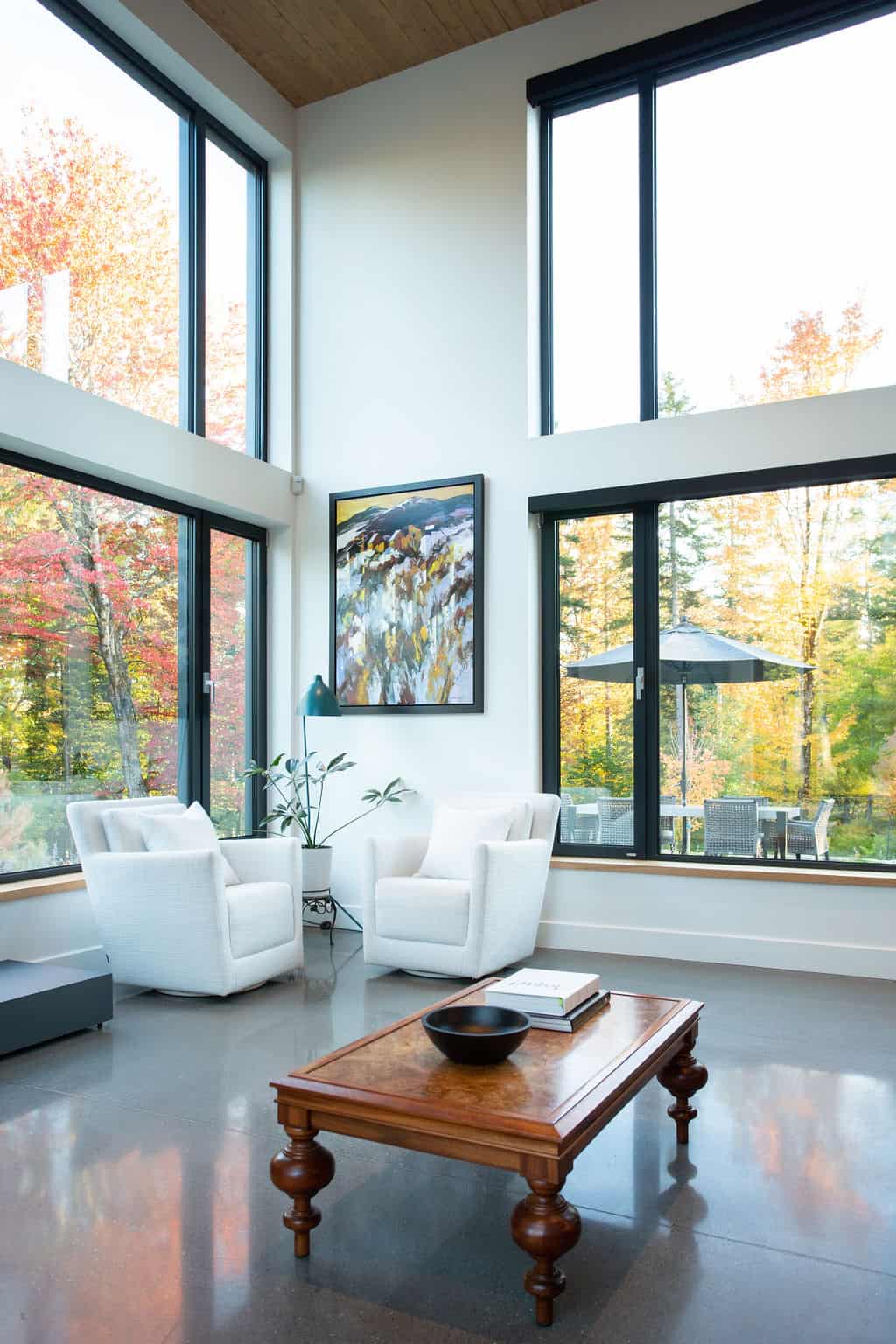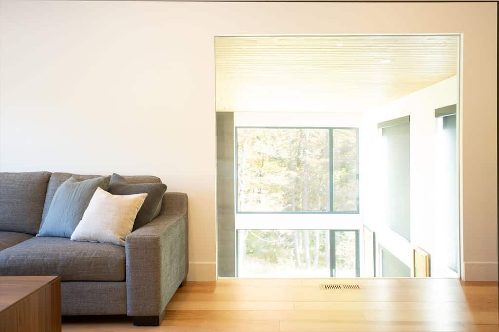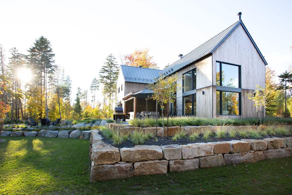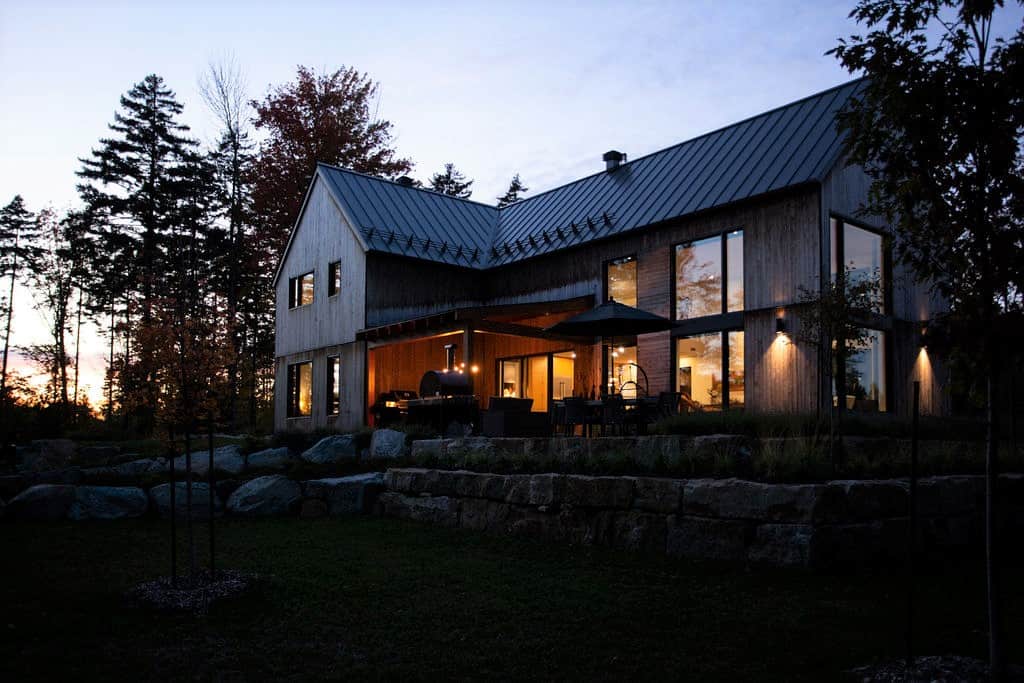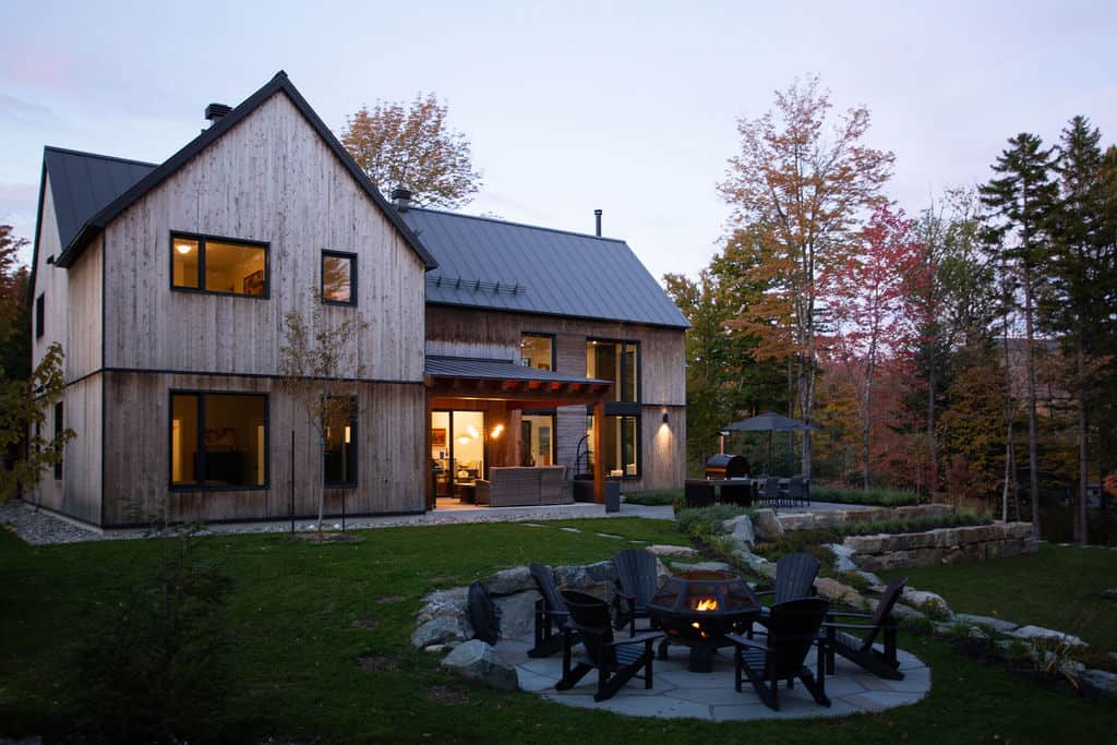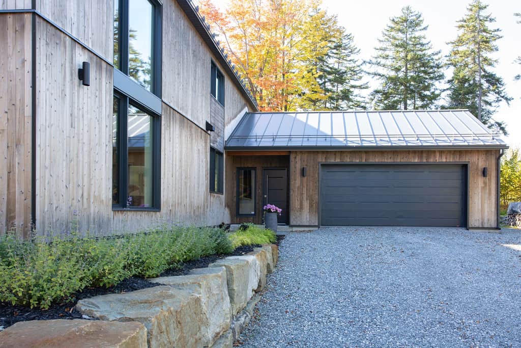 Sobre avec ses lignes simples, l’architecture permet aux volumes et ouvertures de rayonner dans toute leur splendeur. Les regards coulent de l’intérieur vers l’extérieur, dirigés par les percées méticuleusement positionnées sur le mont Orford, avec des vues traversantes. La note finale de cette symphonie entre nature et structure est jouée par la cour arrière privée qui donne l’embarras du choix pour profiter de l’extérieur: terrasse couverte en sapin douglas et terrasse non couverte, jardins complets, espace de feu intime.