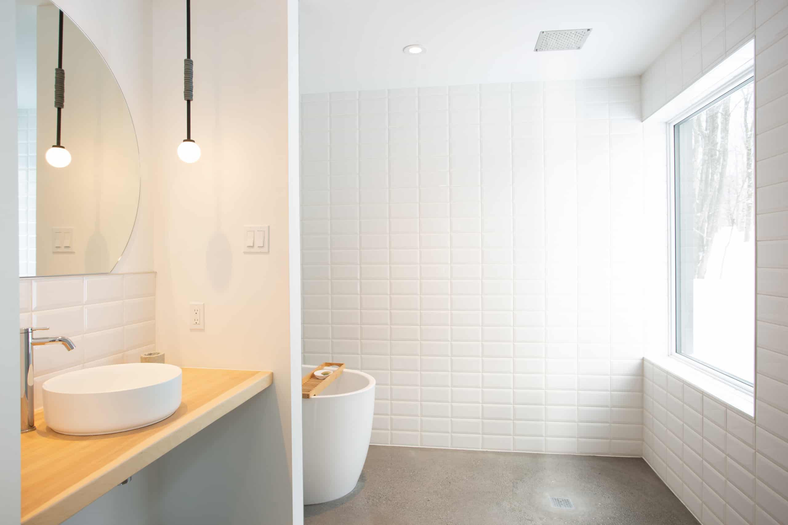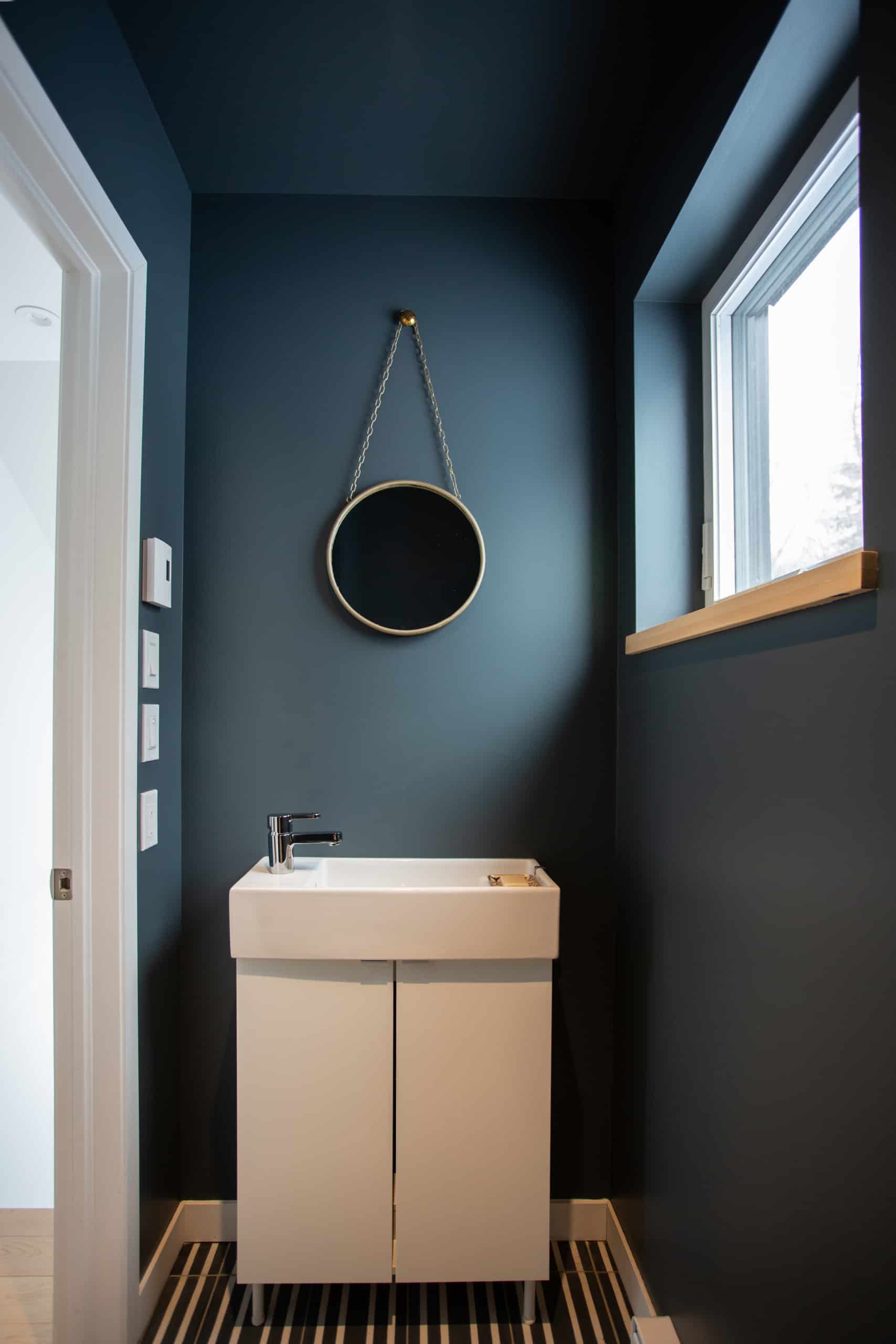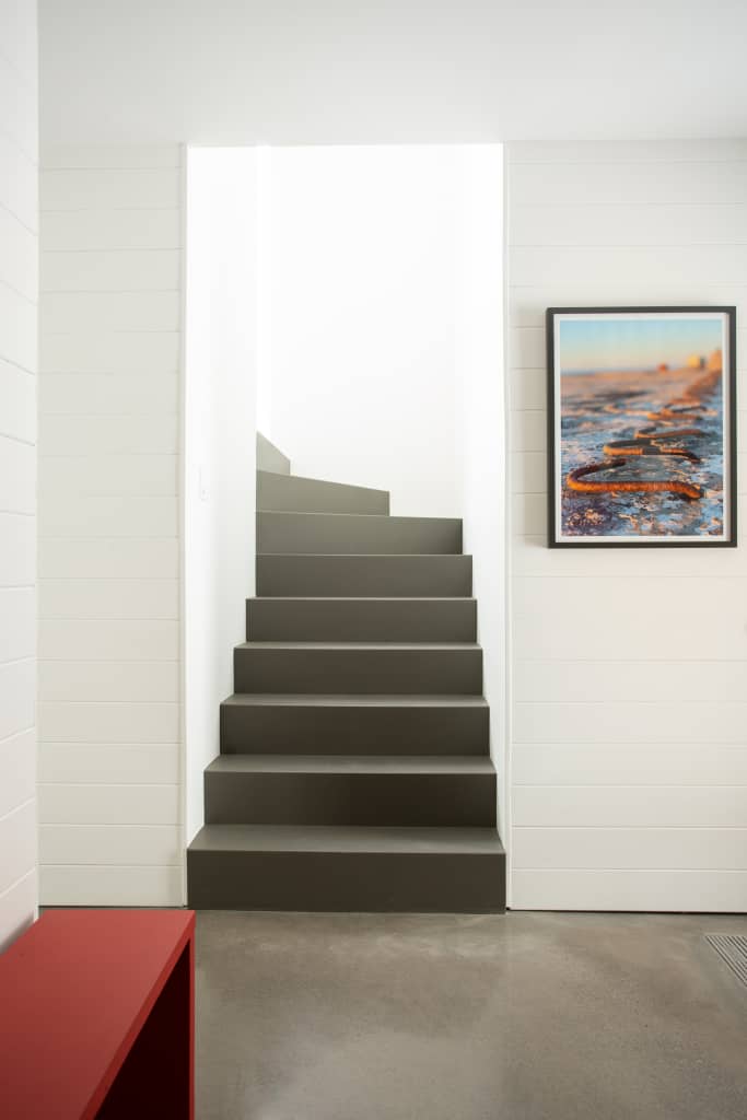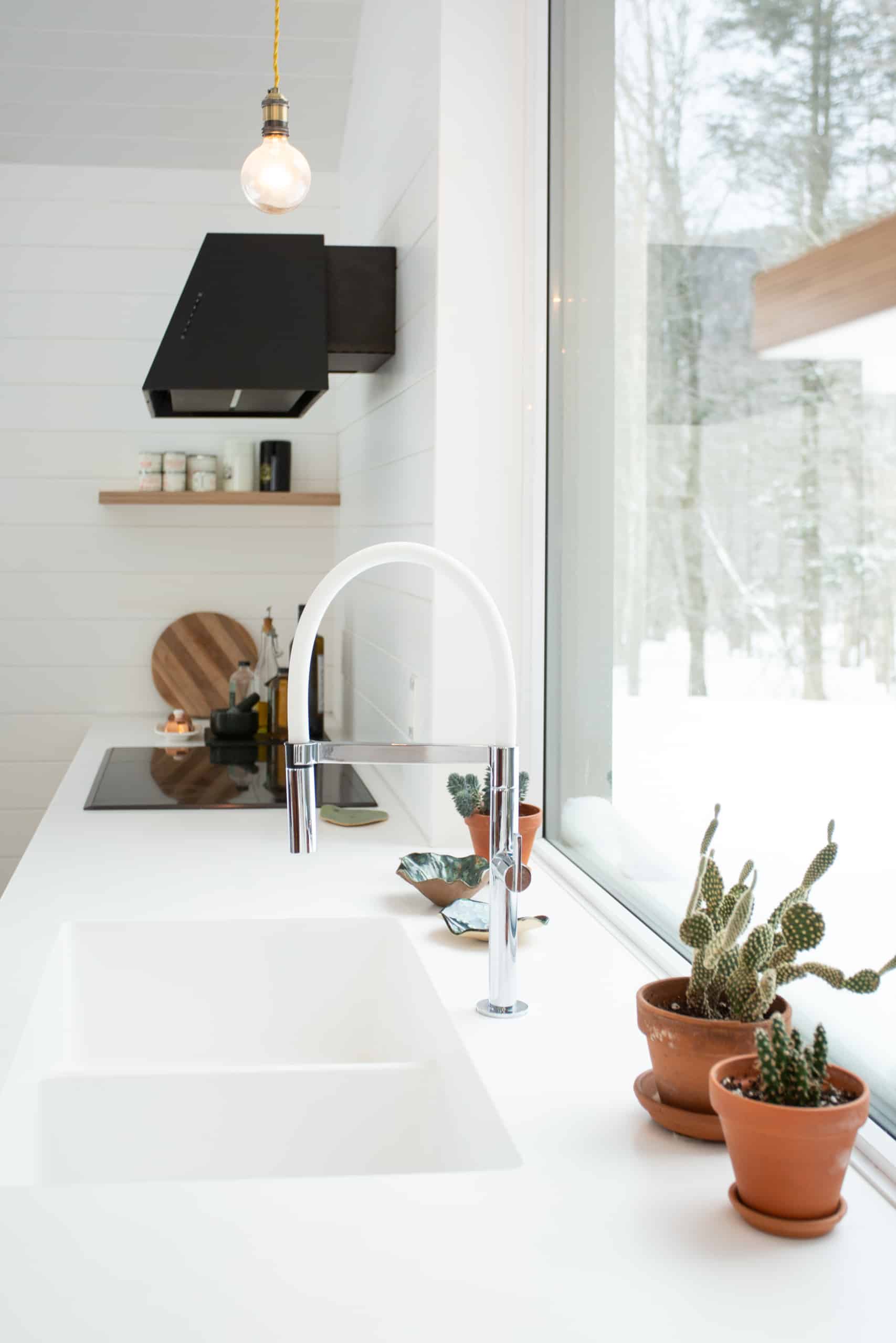Bien que les matériaux soient sans prétention et nous rappellent l’informalité d’un chalet, les finitions intérieures et l’architecture sont toutes en finesse : des murs et portes sans moulures; un plafond cathédrale dans les aires de vie; un comptoir et un évier de cuisine en corian, sans joints. Le confort de nos clients a également été une priorité lors des choix en conception : une enveloppe ultra performante, des planchers chauffants, une suite des maîtres privée au rez-de-chaussée et une suite pour les enfants et invités à l’étage. Tous profitent à la fois d’un séjour commun dans les aires de vies, mais aussi plus intime lorsque besoin.
