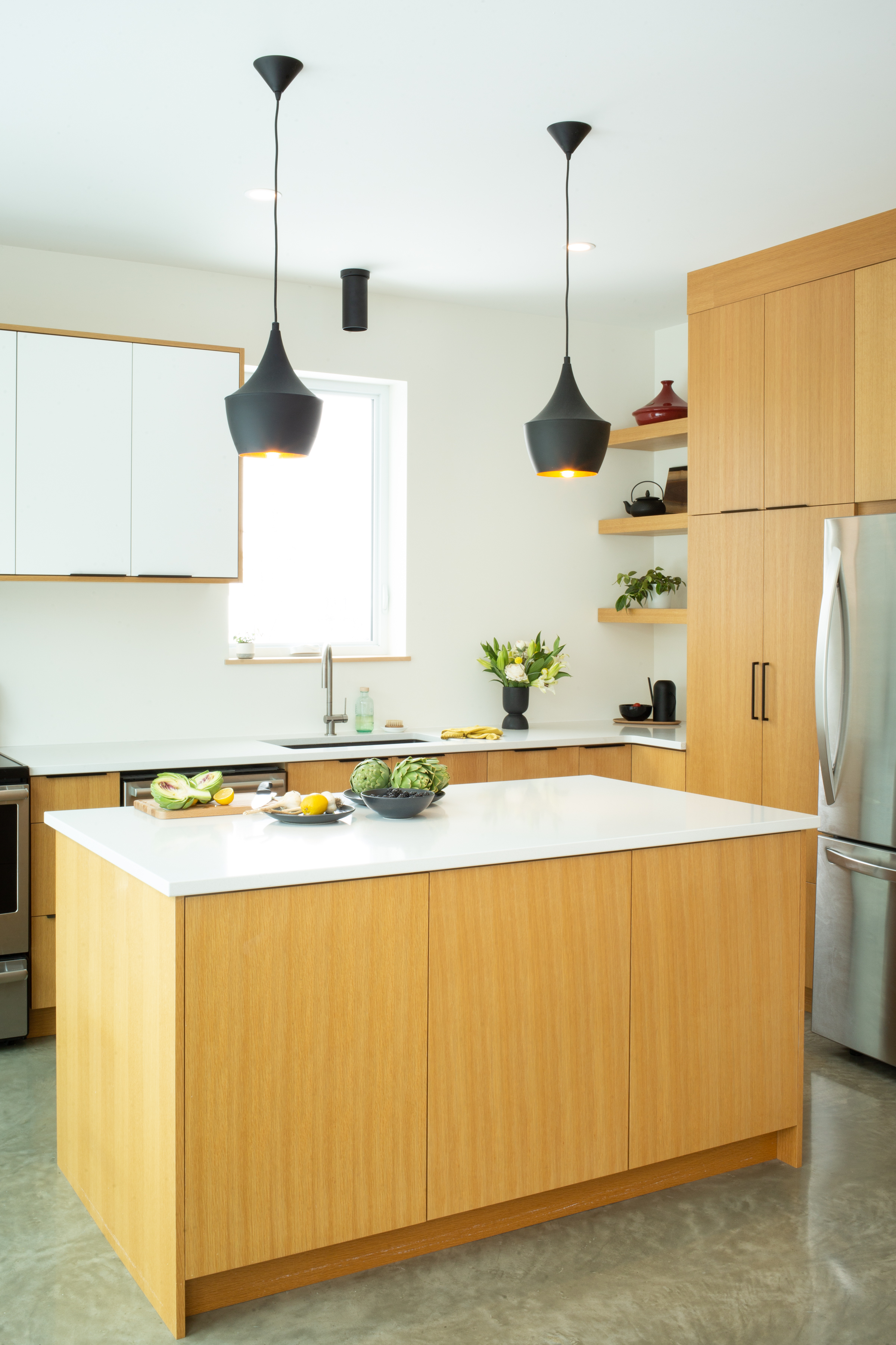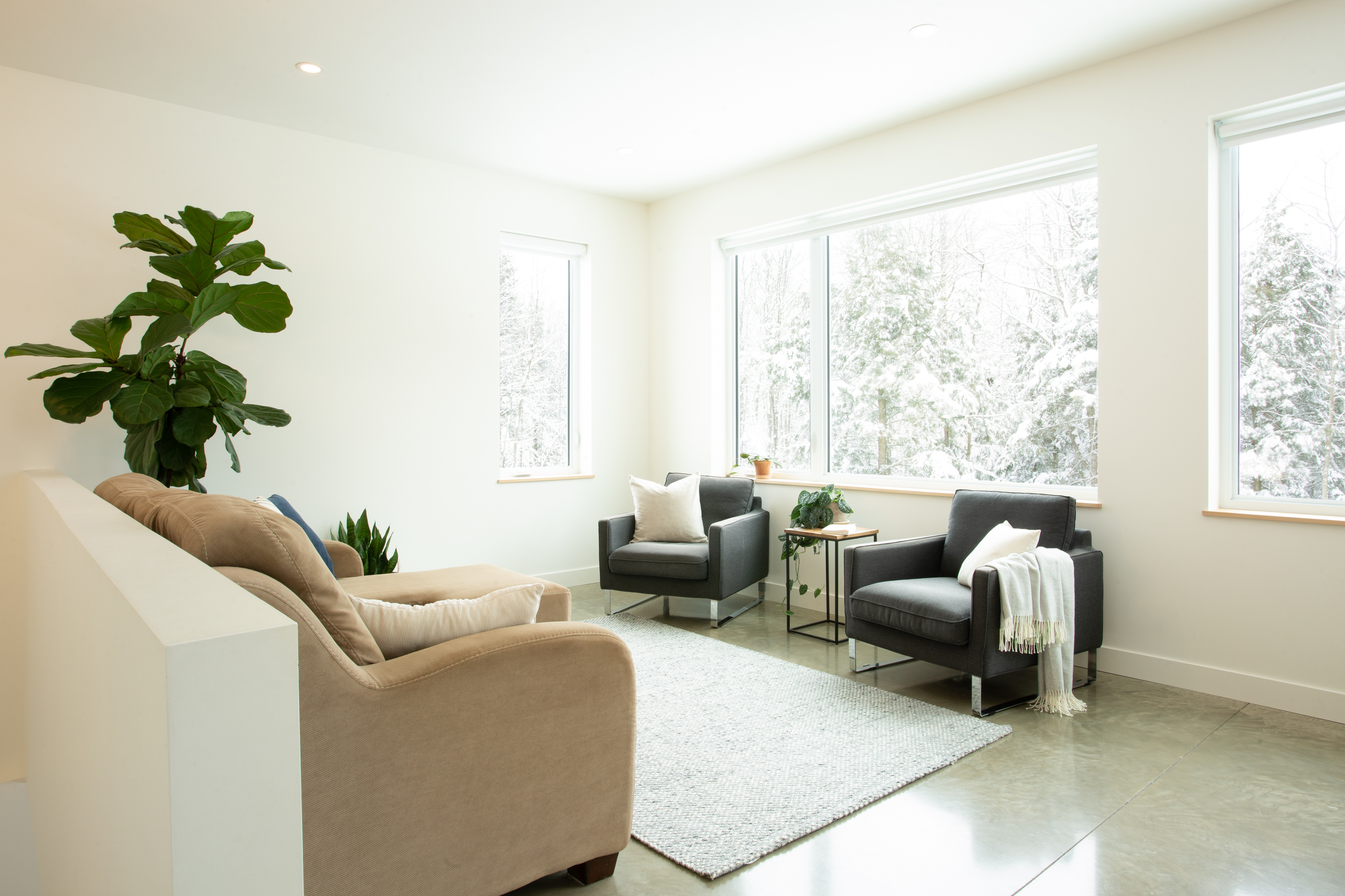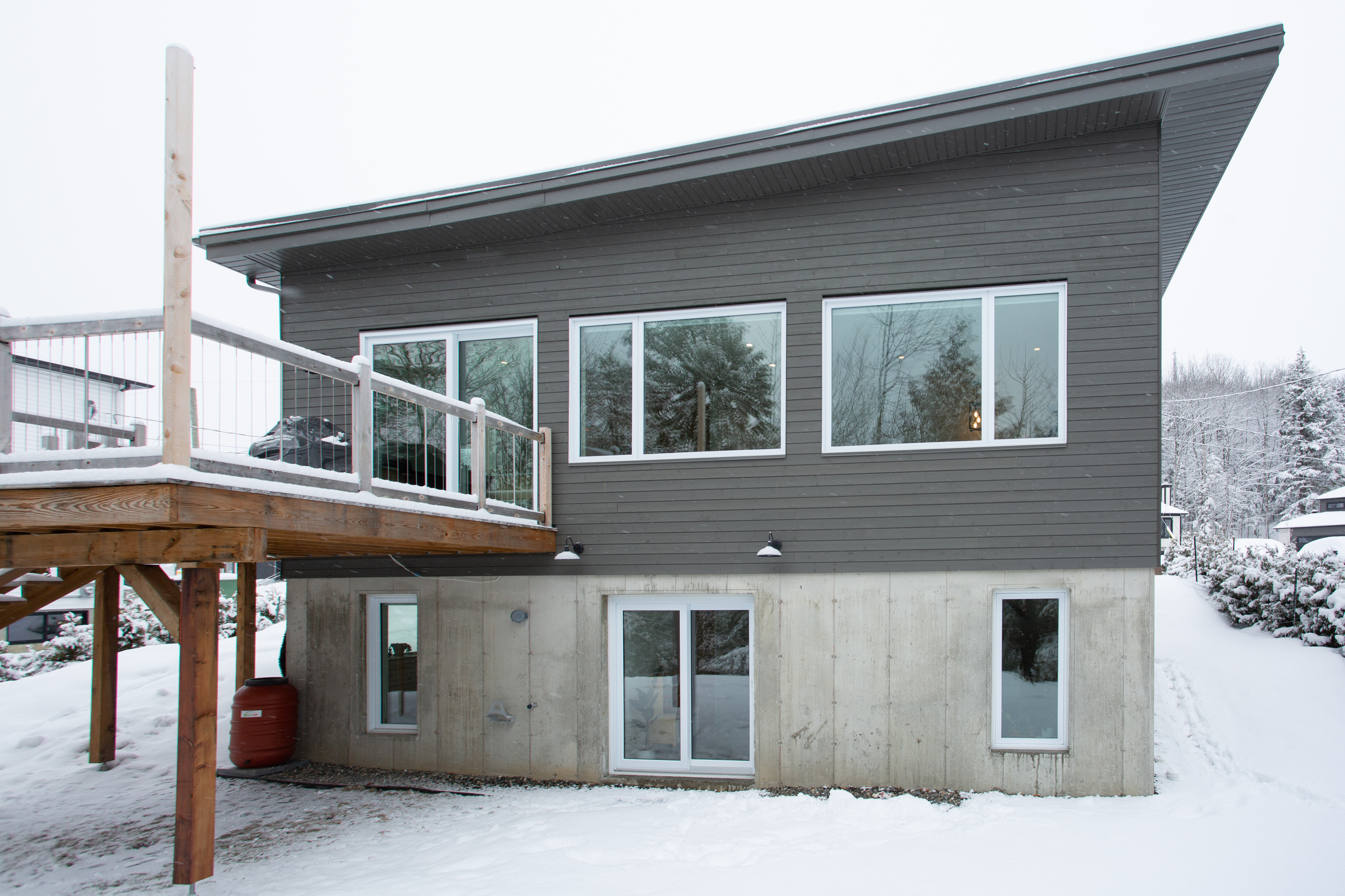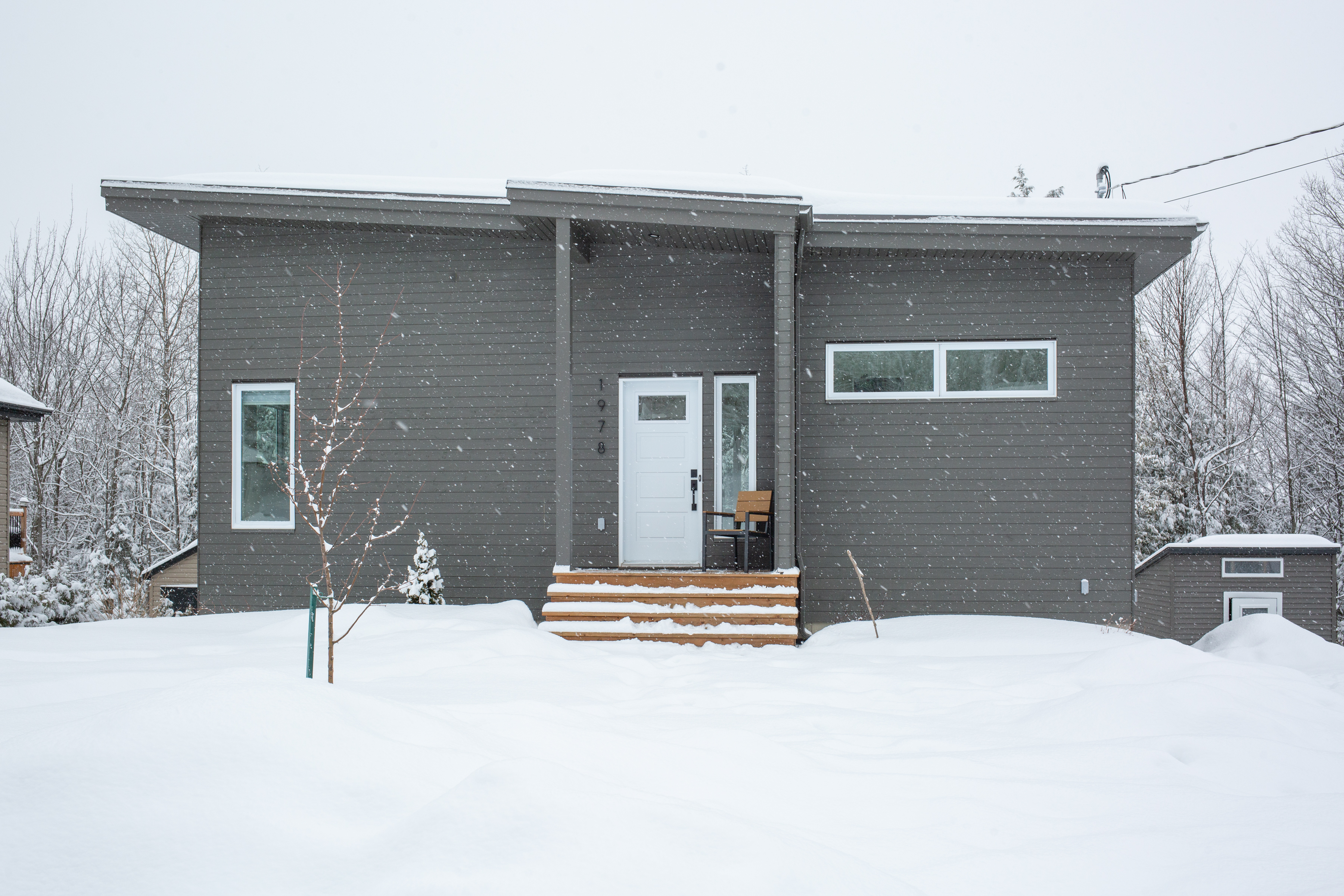 Cette maison a été conçue par nous, puis construite en tâches partagées avec nos clients. Lors de l’élaboration des plans, une attention particulière a été portée à fluidité entre les espaces, accentuée par des lignes pures et des zones de transition plus larges qu’à l’habitude. La disposition des pièces selon leurs usages et les aires de vies rectilignes permettent de se déplacer de façon intuitive. Bien que les voisins soient plutôt près, la disposition des fenêtres permet de maximiser l’intimité familiale de nos clients et de se sentir immergé en nature.