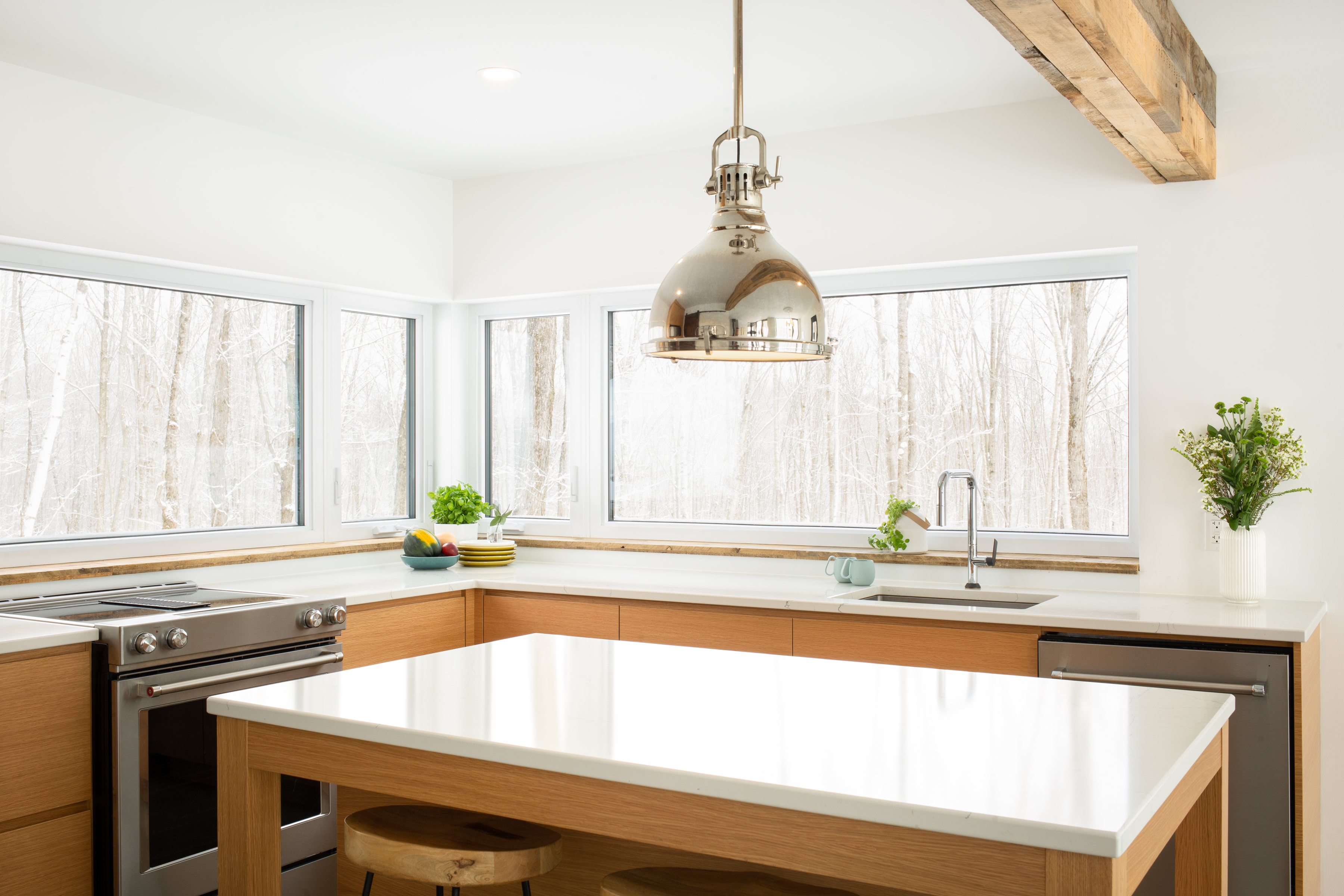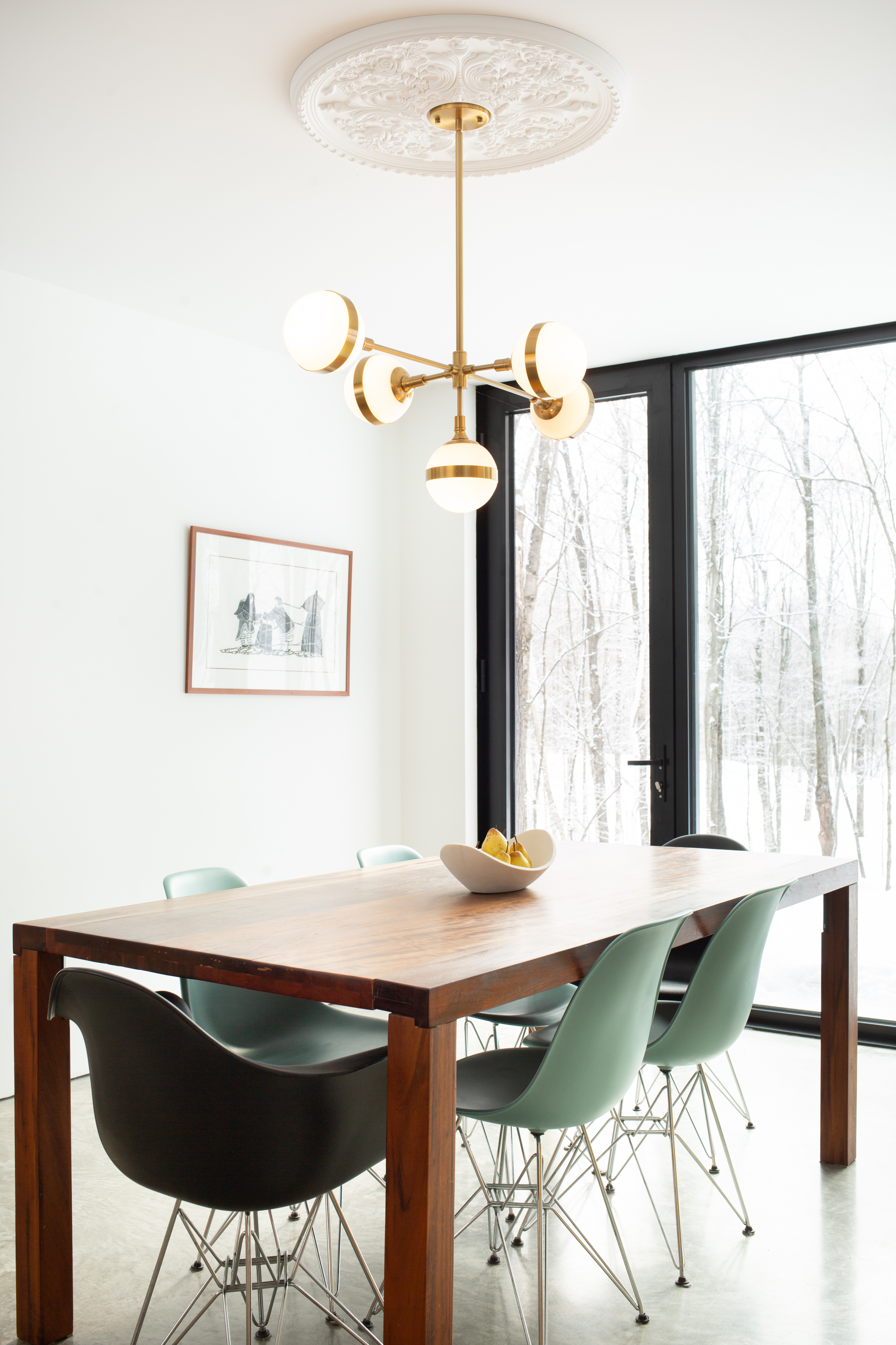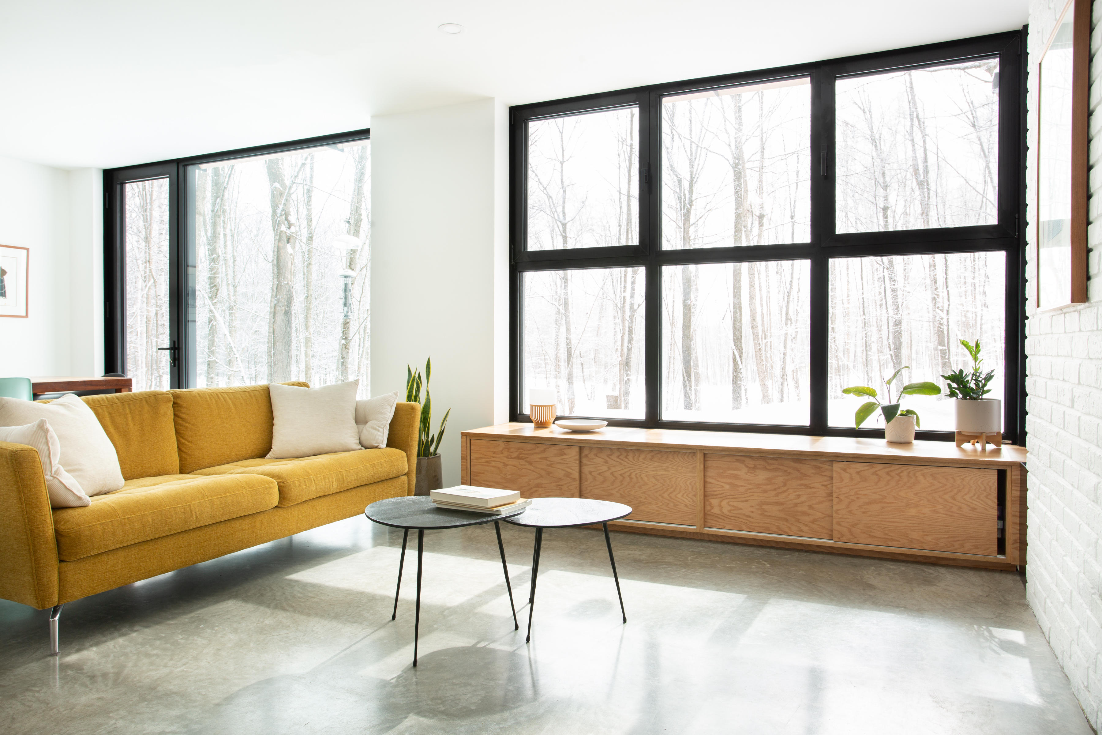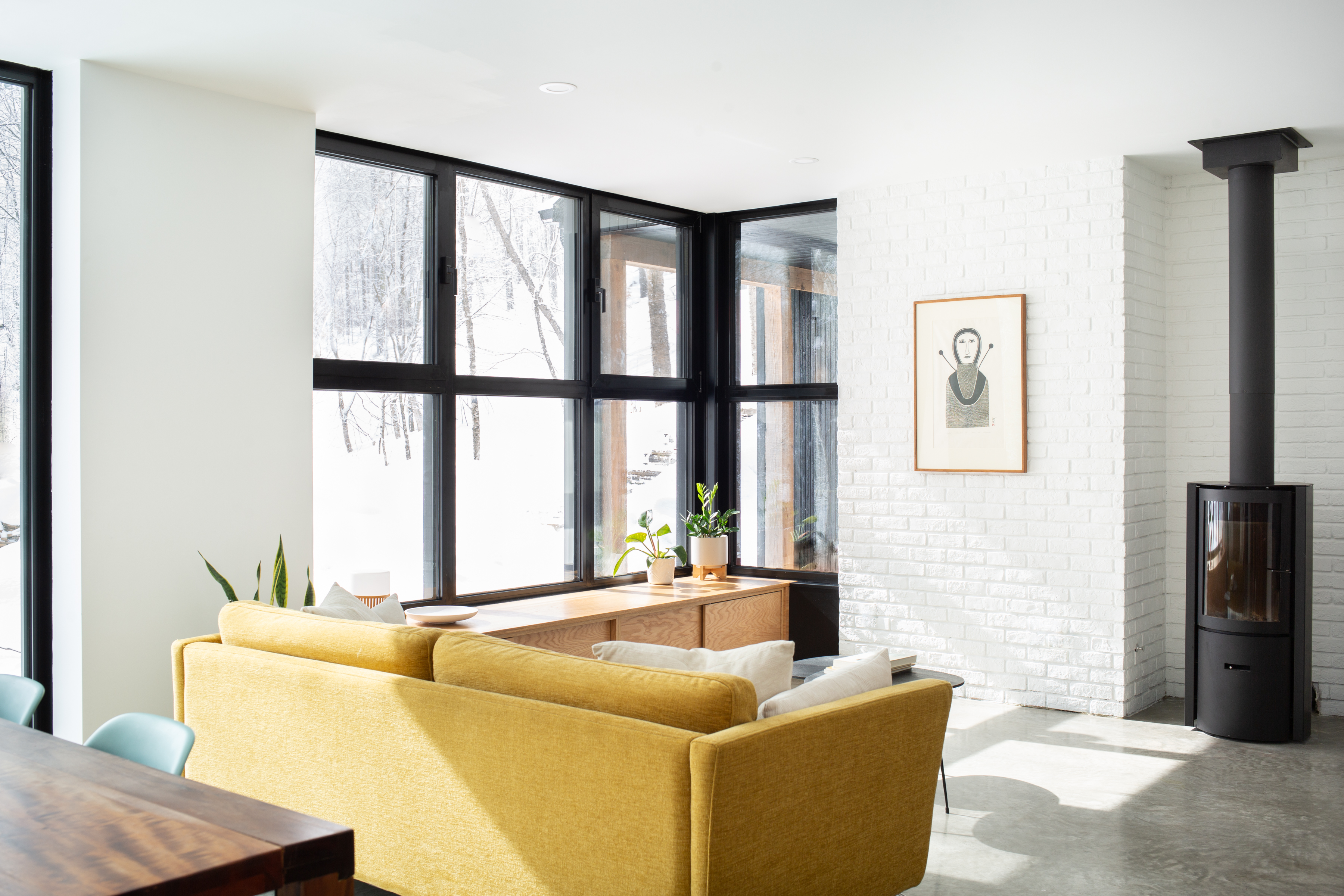 Conçue et construite sur mesure par UrbanÉco, cette réalisation est parfaitement à l’image de nos clients et leur famille : pleine de couleurs et dynamique ! Multiples détails architecturaux et matérialités d’inspiration antique, industrielle et de milieu du siècle racontent l’histoire de cette maison, comme une rosace au plafond, une poutre vêtue de bois de grange dans la cuisine et un escalier en acier. Comme bien d’autres, nos clients ont décidé de quitter Montréal et de s’installer dans les Cantons-de-l ’Est pour profiter d’une vie de famille plus équilibrée. Idéalement située dans une forêt d’arbres matures et à distance de marche d’un étang privé pour la baignade des résidents du quartier, c’est l’endroit de rêve pour le télétravail et voir grandir leurs enfants.