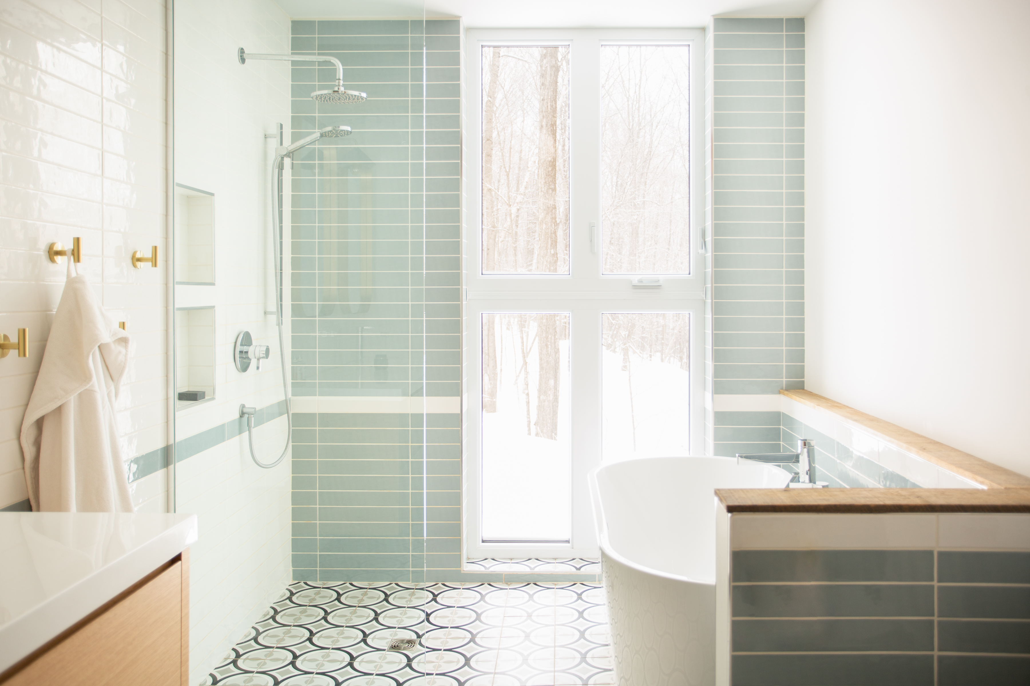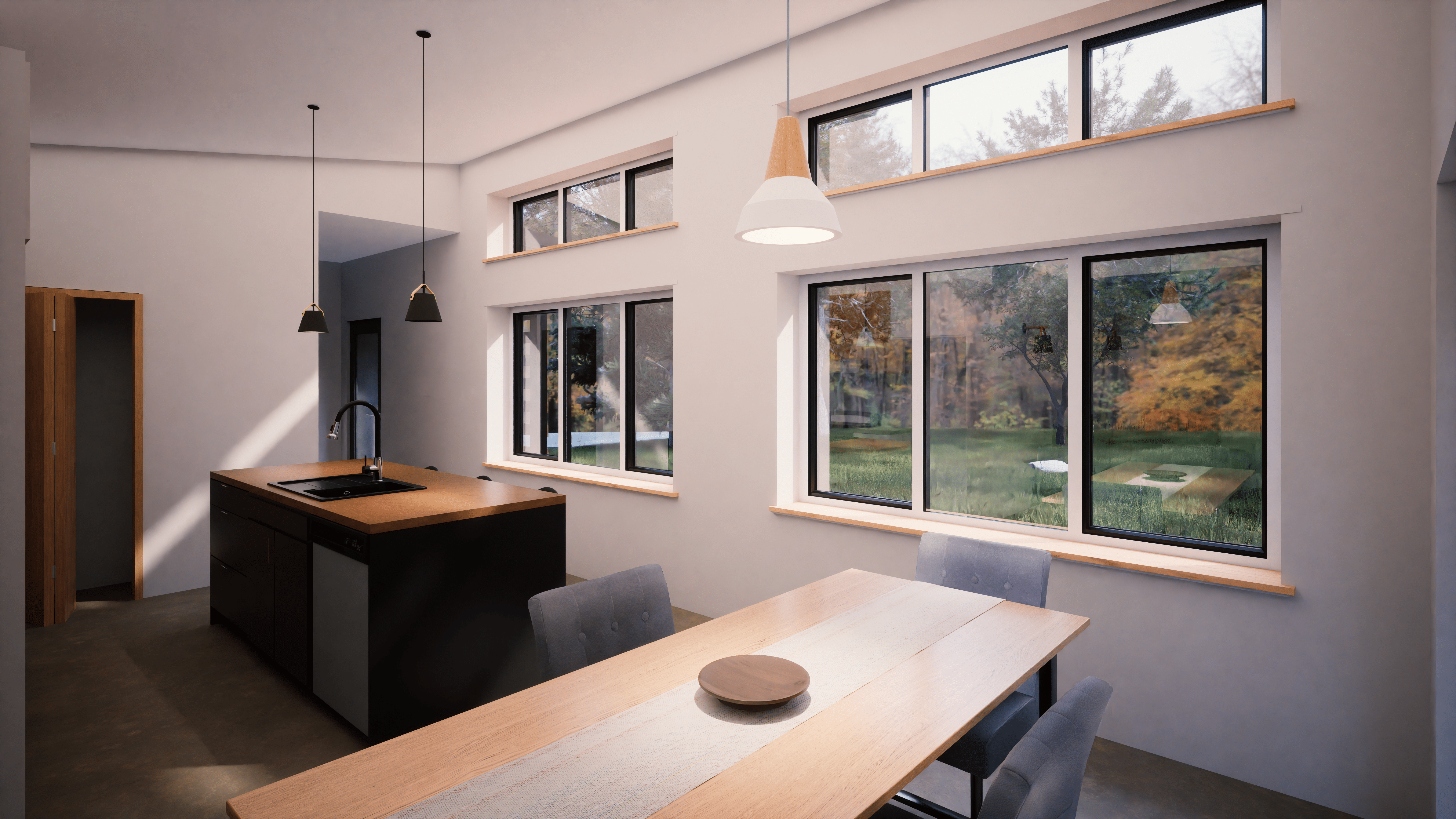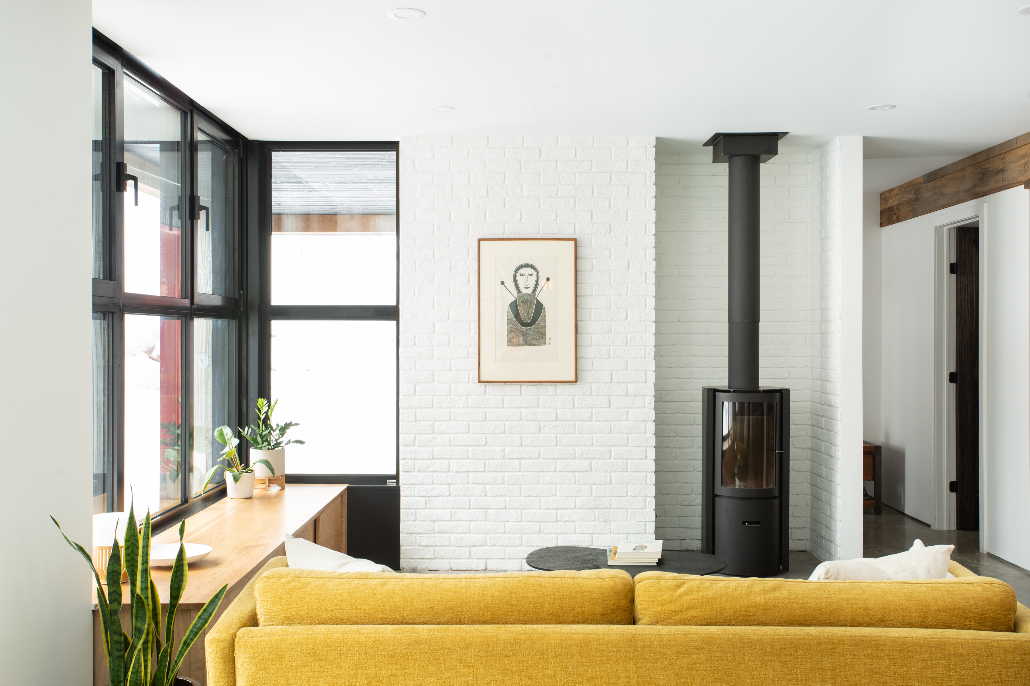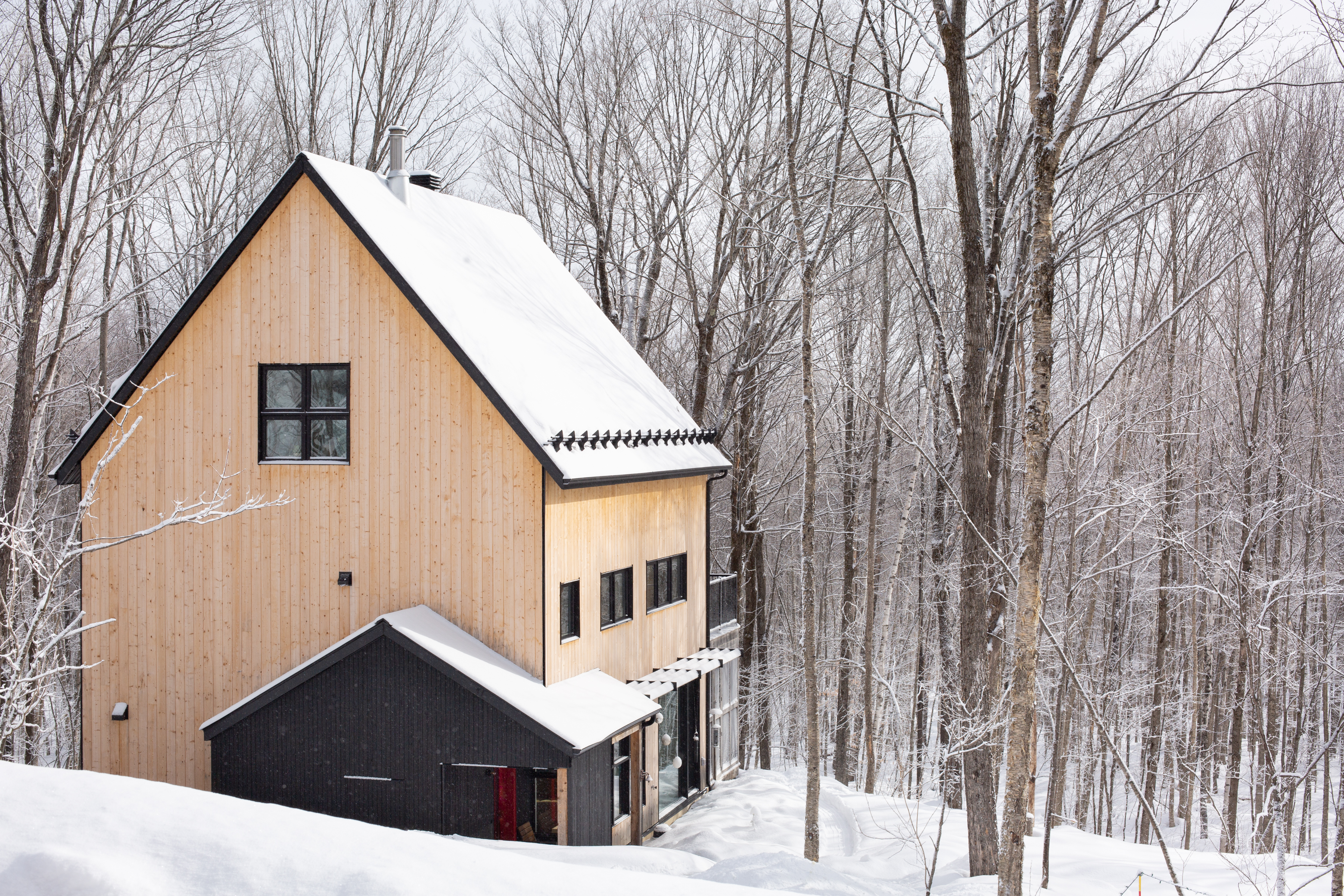Conçue et construite sur mesure par UrbanÉco, cette réalisation est parfaitement à l’image de nos clients et leur famille : pleine de couleurs et dynamique ! Multiples détails architecturaux et matérialités d’inspiration antique, industrielle et de milieu du siècle racontent l’histoire de cette maison, comme une rosace au plafond, une poutre vêtue de bois de grange dans la cuisine et un escalier en acier. Comme bien d’autres, nos clients ont décidé de quitter Montréal et de s’installer dans les Cantons-de-l ’Est pour profiter d’une vie de famille plus équilibrée. Idéalement située dans une forêt d’arbres matures et à distance de marche d’un étang privé pour la baignade des résidents du quartier, c’est l’endroit de rêve pour le télétravail et voir grandir leurs enfants.