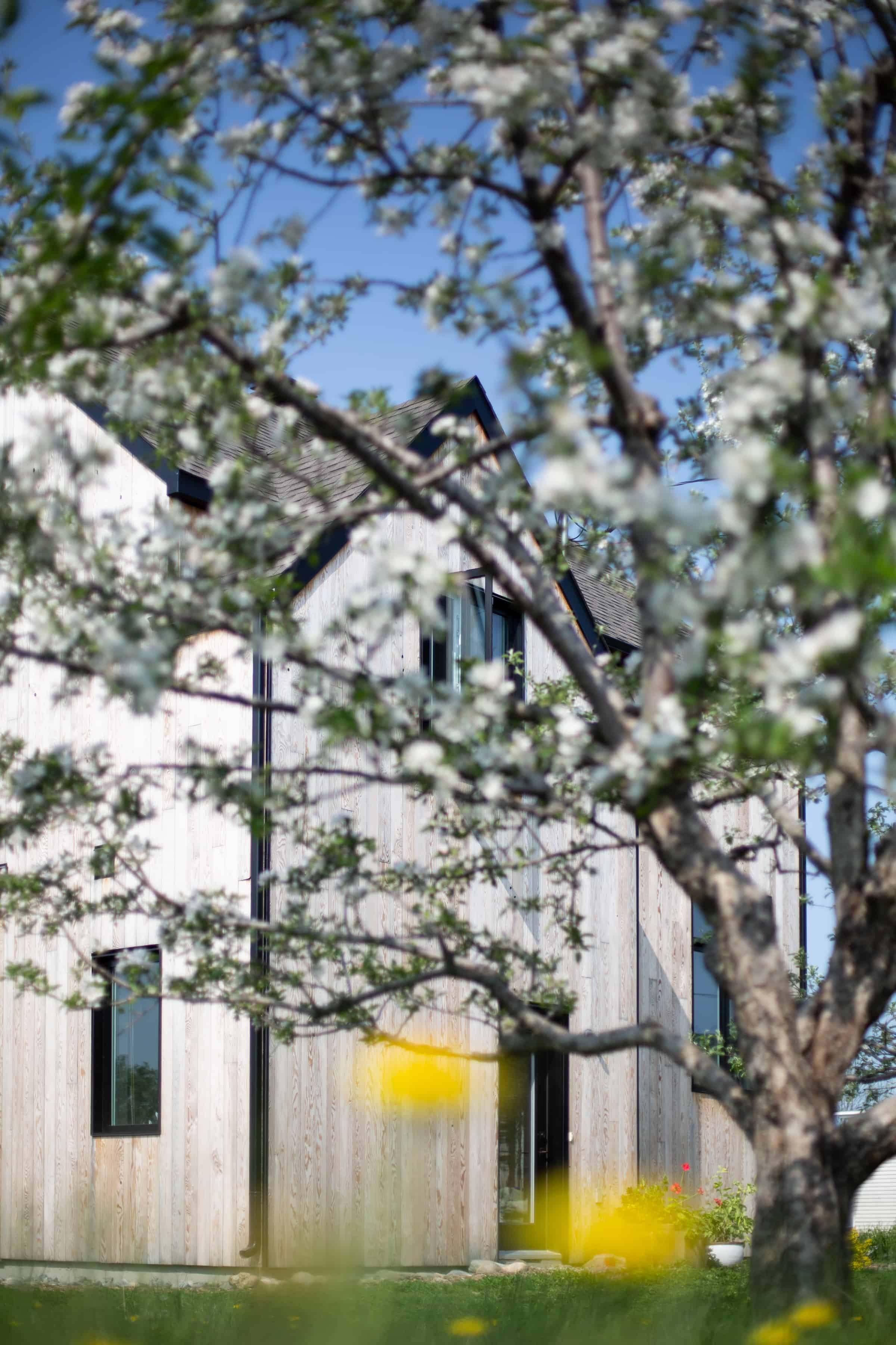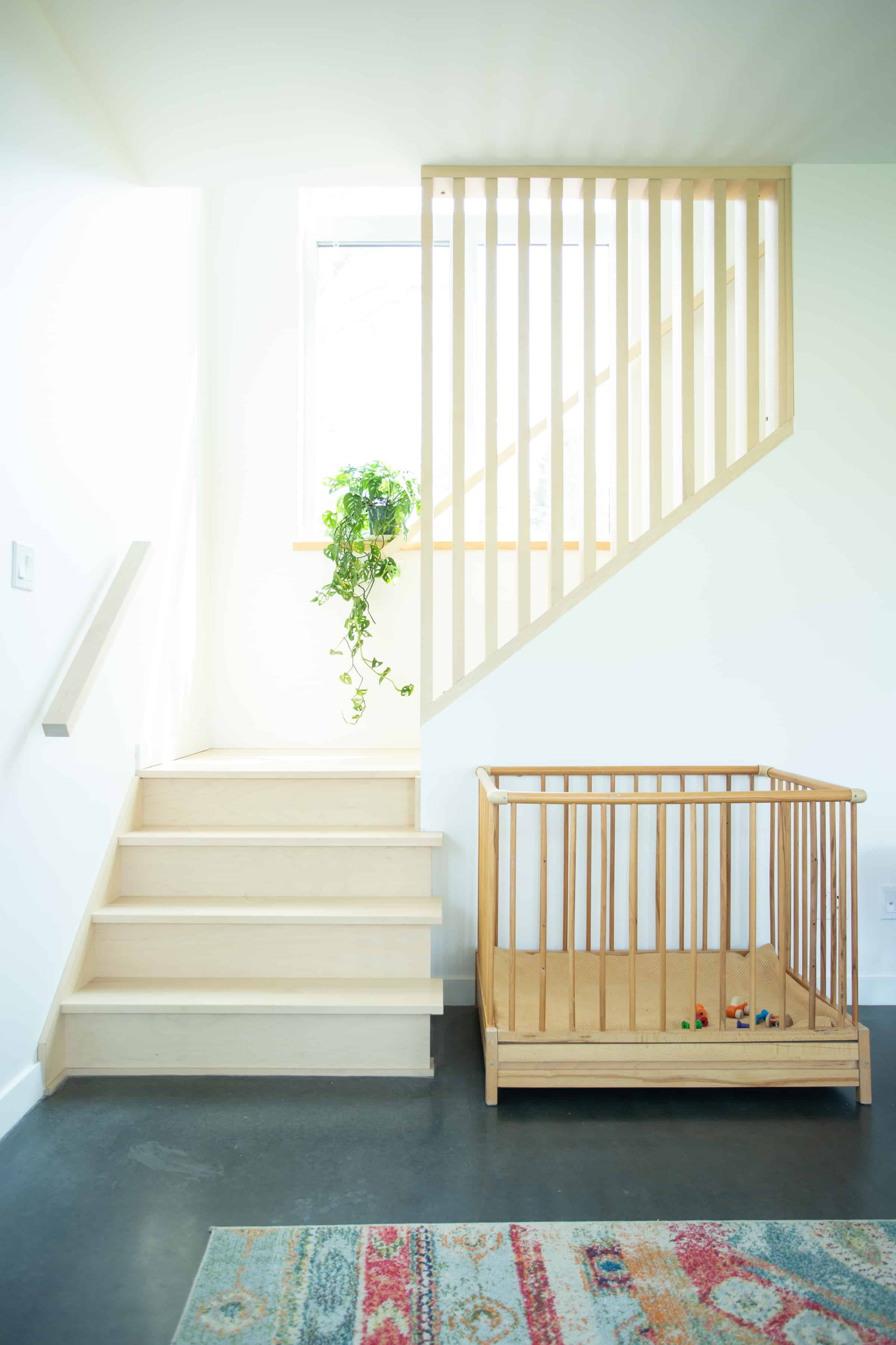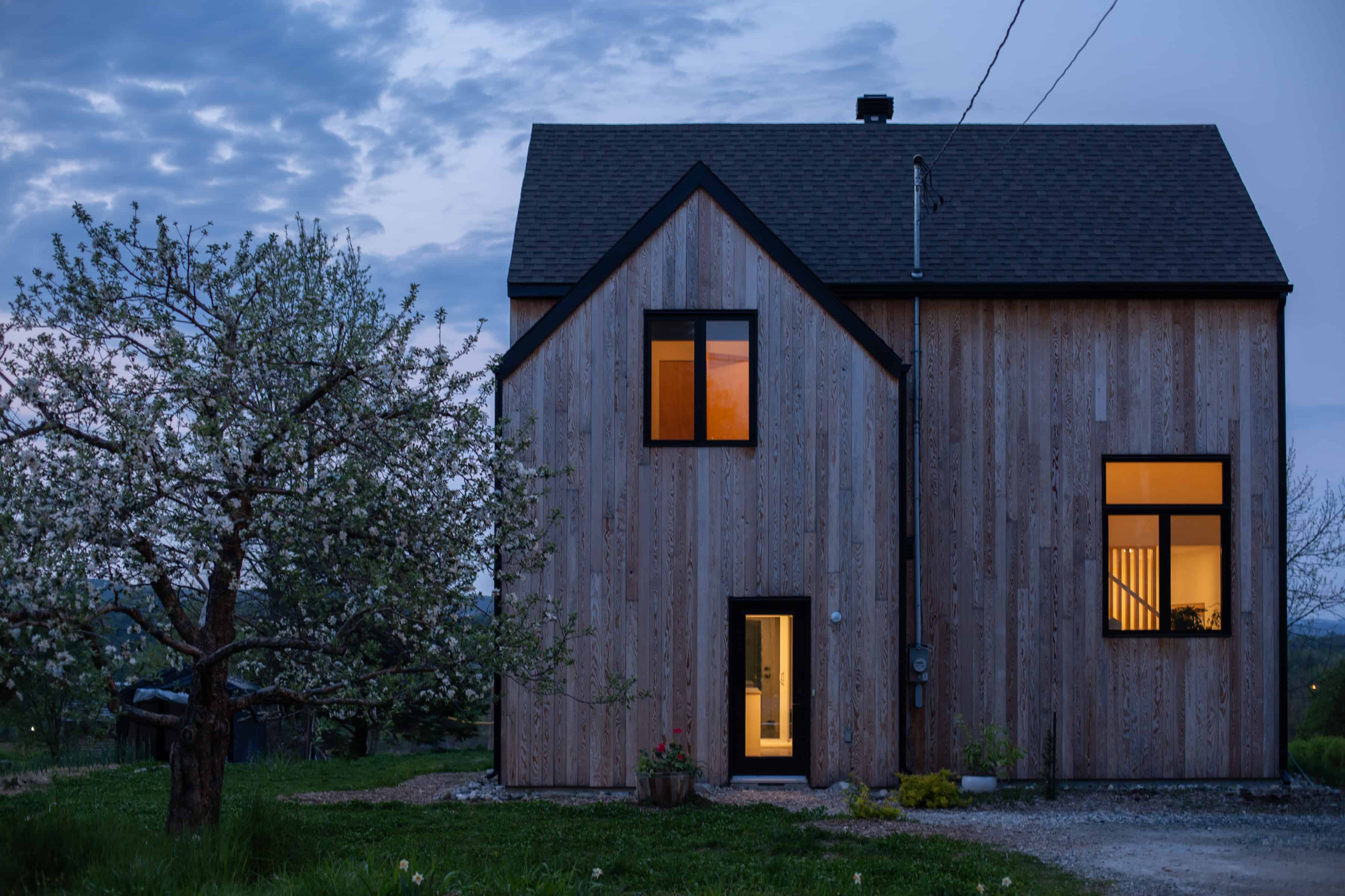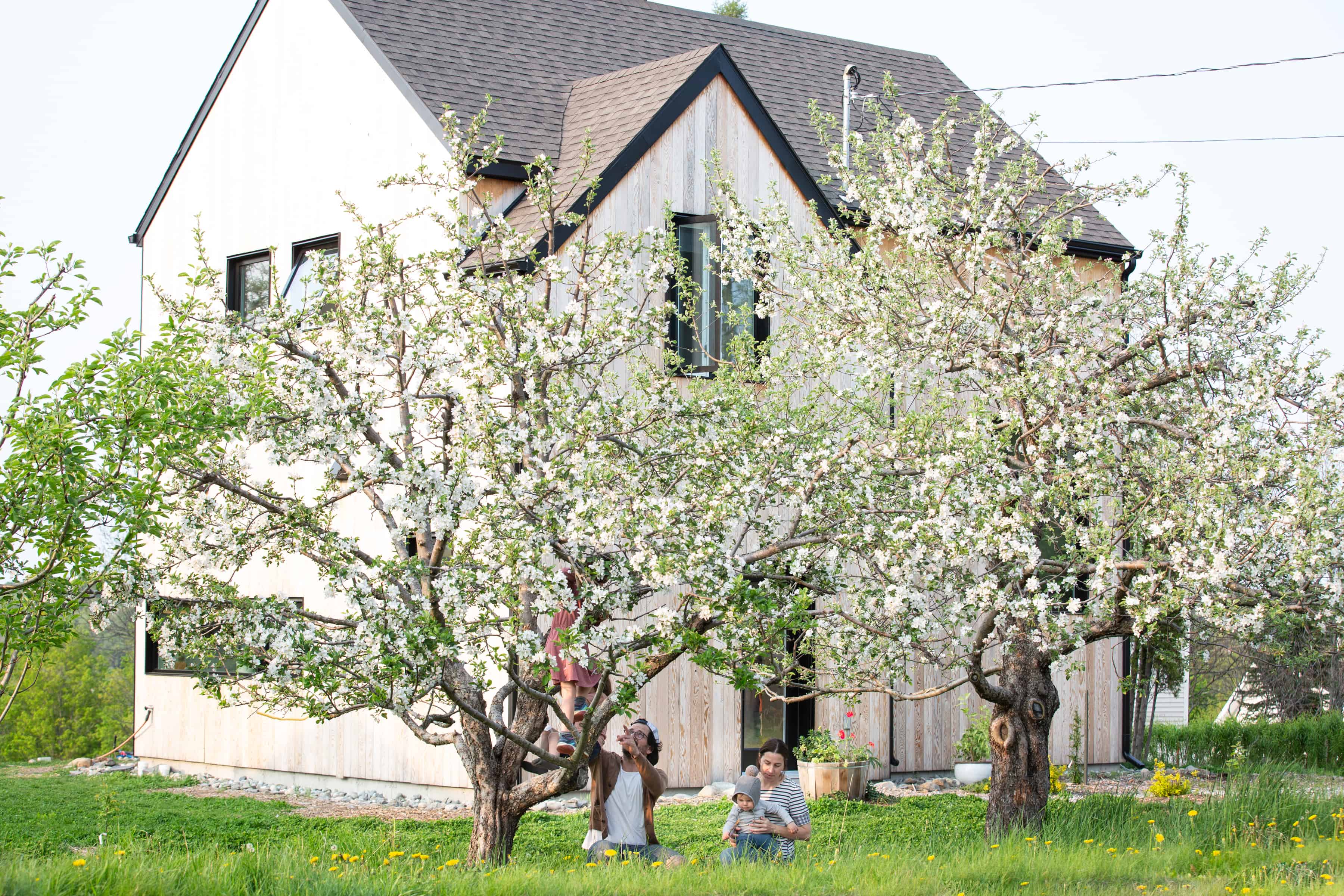 La disposition de la maison a été pensée avec soin tout en respectant le terrain et le pommier bien mature qui s’y trouvait. Les deux étages de la maison abritent trois chambres, deux salles de bain et une dalle de béton comme plancher chauffant afin de bien convenir au tout petit se promenant à quatre pattes. Le tout construit avec des matériaux nobles et dans une optique minimaliste et scandinave, nous pouvons retrouver plusieurs éléments qui rappellent cet esthétisme, dont les garde-corps des escaliers qui ont été dessinés et réalisés afin de convenir parfaitement à l’atmosphère de ce nid douillet. Pour accompagner le tout, la maison a une vue exceptionnelle sur un champ avec coucher de soleil, et ce à quelques minutes de la ville, dans un quartier résidentiel.