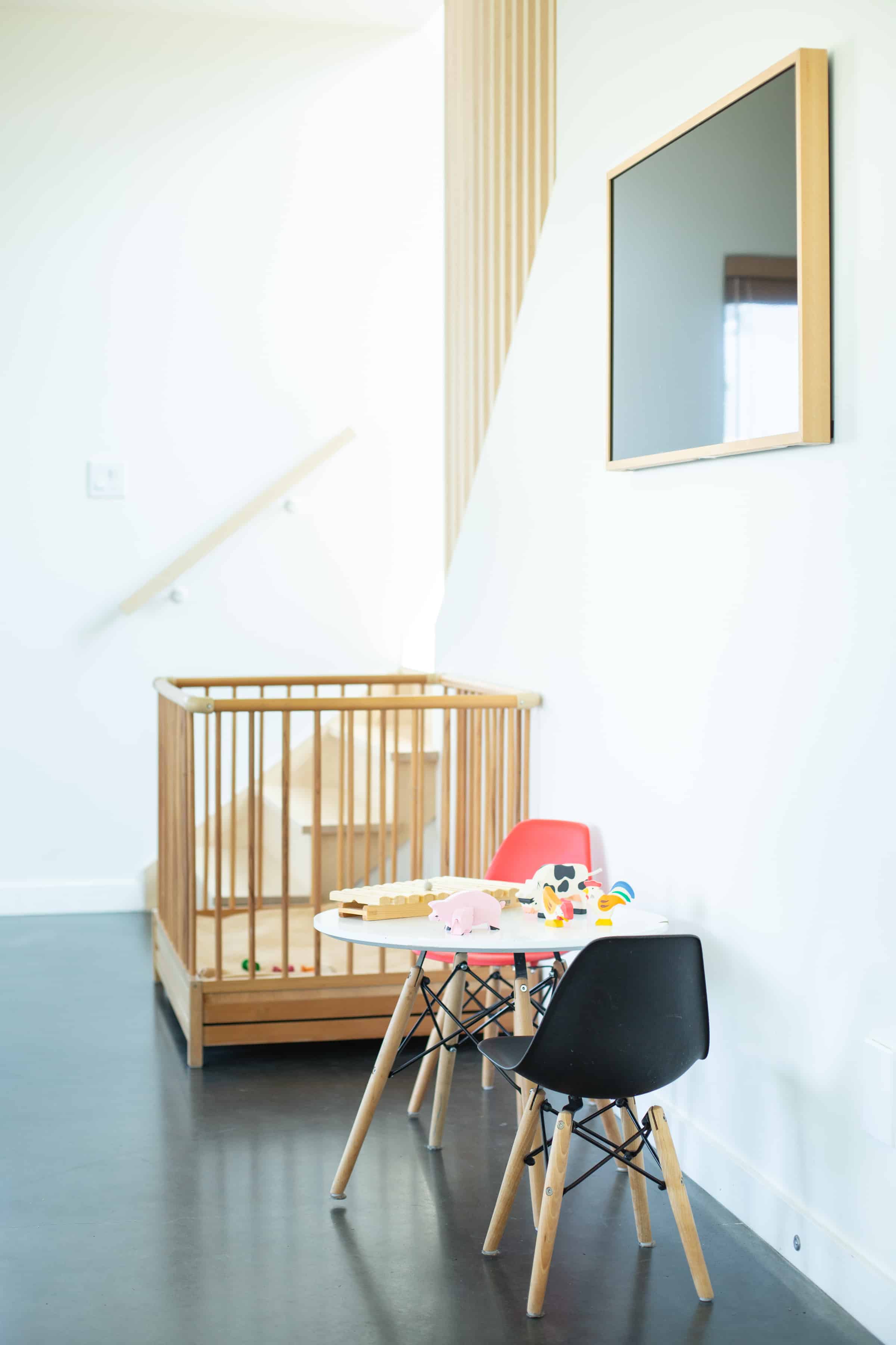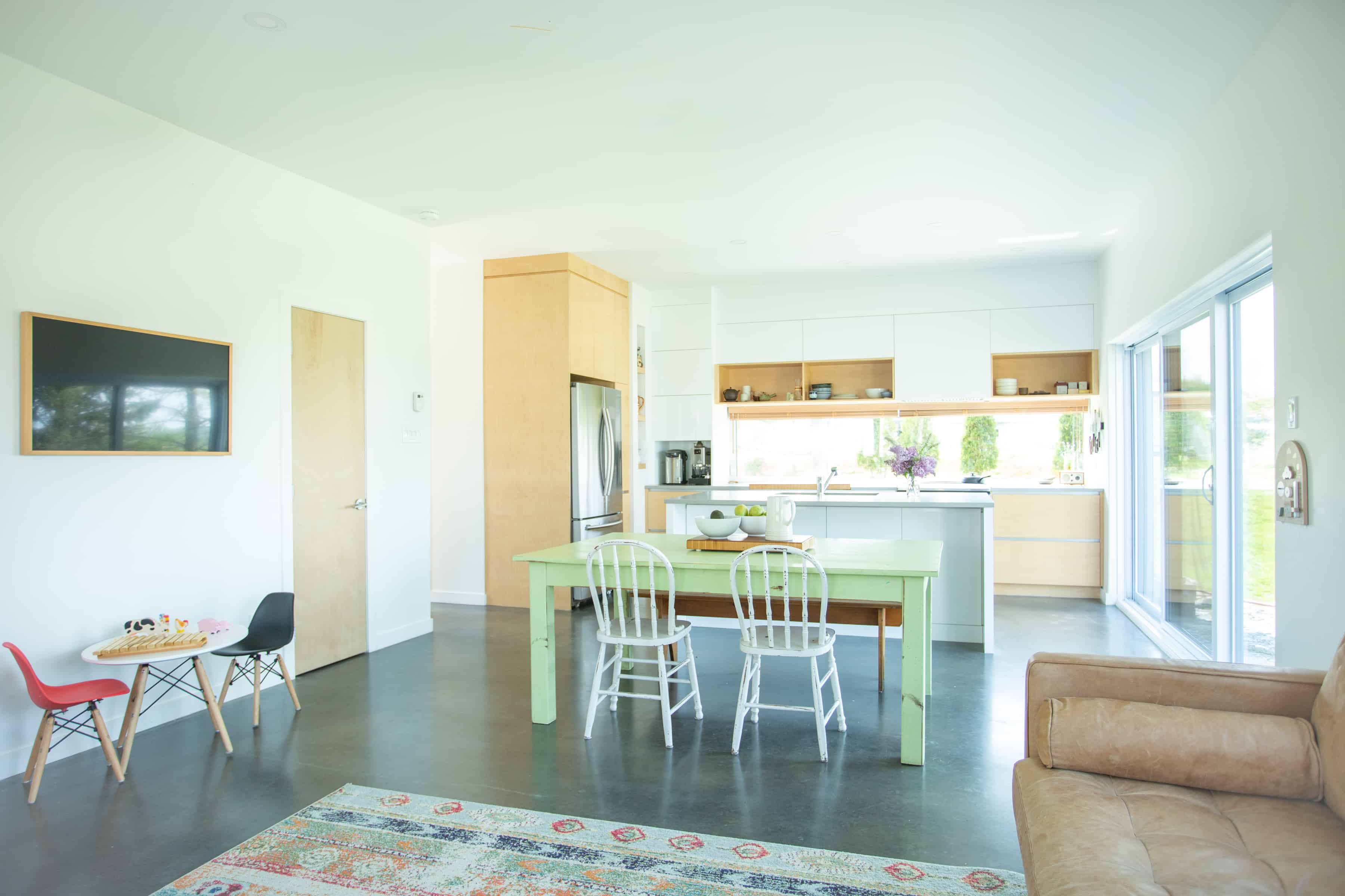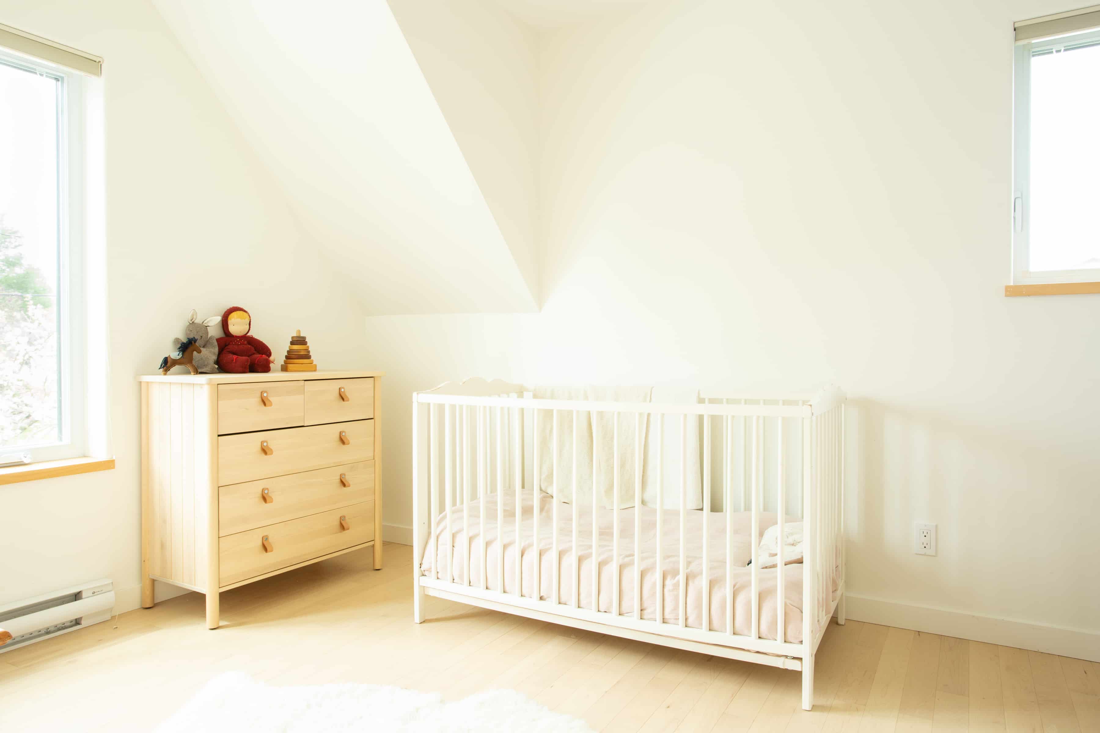 La disposition de la maison a été pensée avec soin tout en respectant le terrain et le pommier bien mature qui s’y trouvait. Les deux étages de la maison abritent trois chambres, deux salles de bain et une dalle de béton comme plancher chauffant afin de bien convenir au tout petit se promenant à quatre pattes. Le tout construit avec des matériaux nobles et dans une optique minimaliste et scandinave, nous pouvons retrouver plusieurs éléments qui rappellent cet esthétisme, dont les garde-corps des escaliers qui ont été dessinés et réalisés afin de convenir parfaitement à l’atmosphère de ce nid douillet. Pour accompagner le tout, la maison a une vue exceptionnelle sur un champ avec coucher de soleil, et ce à quelques minutes de la ville, dans un quartier résidentiel.
