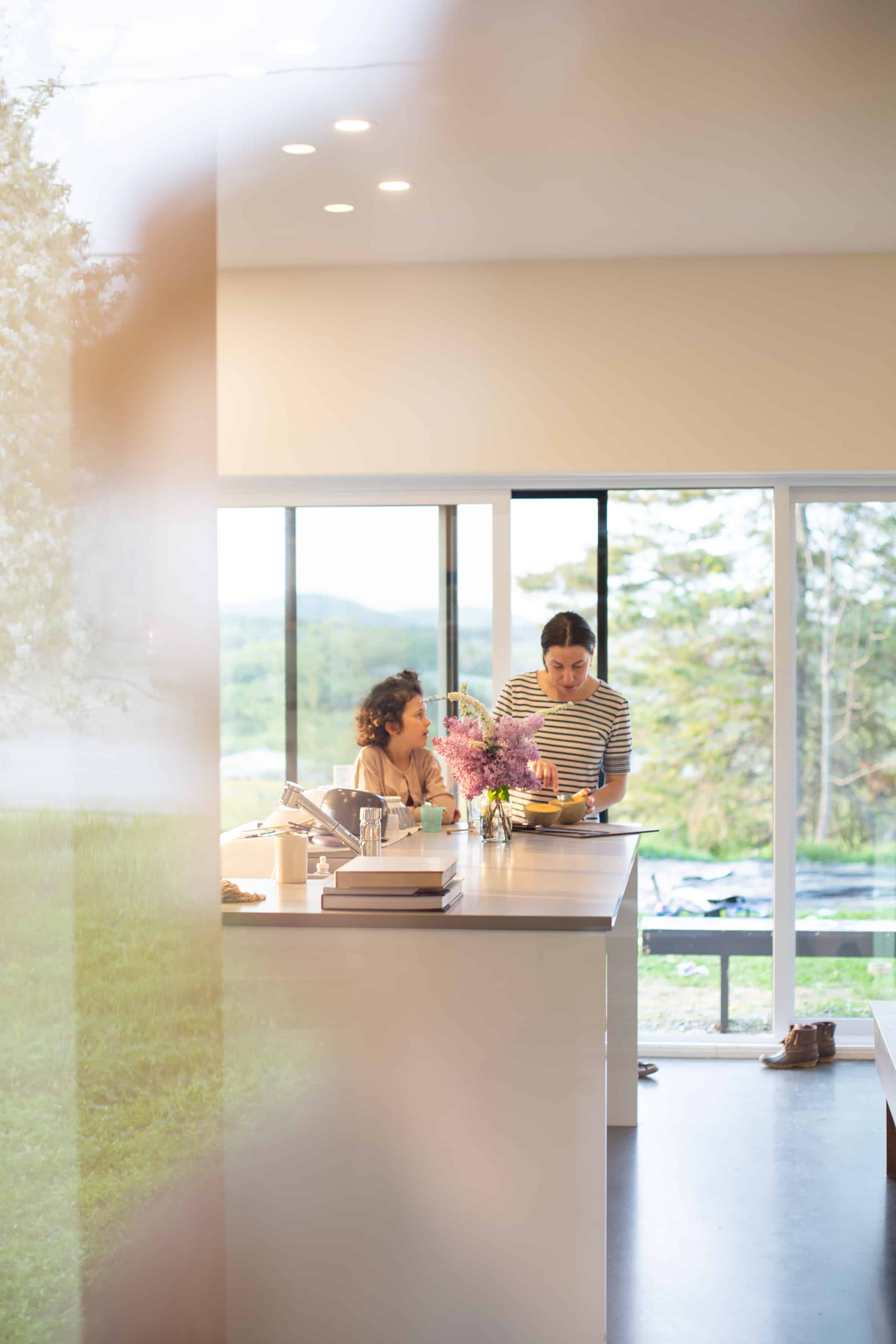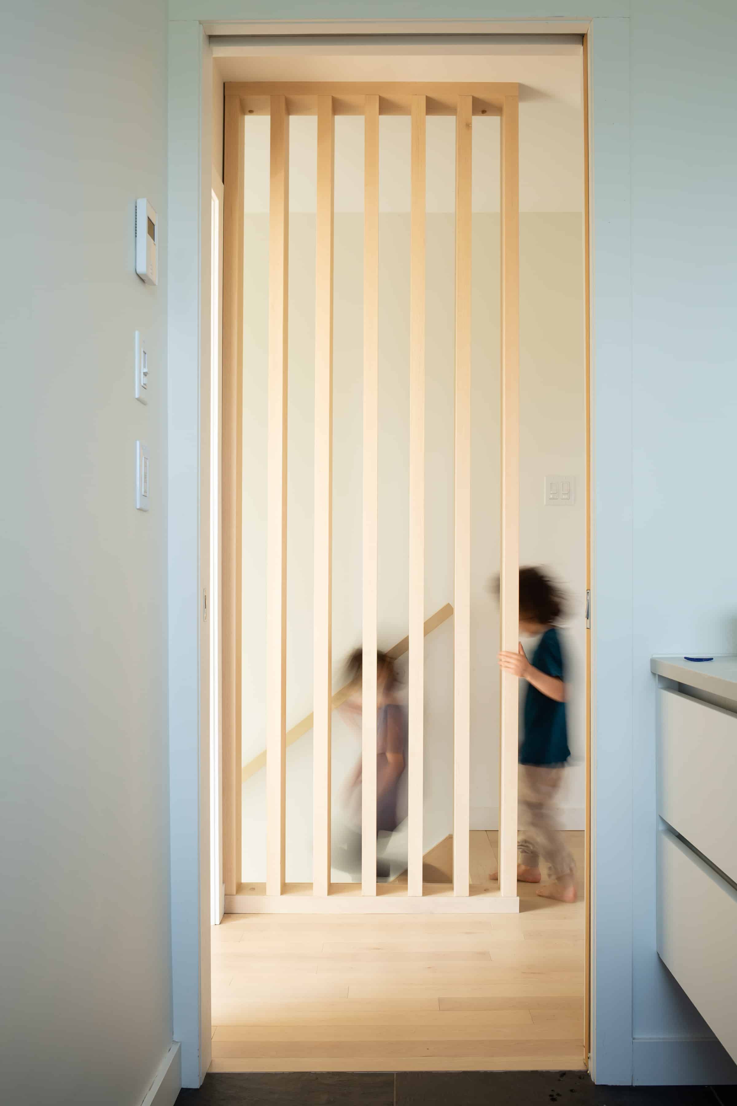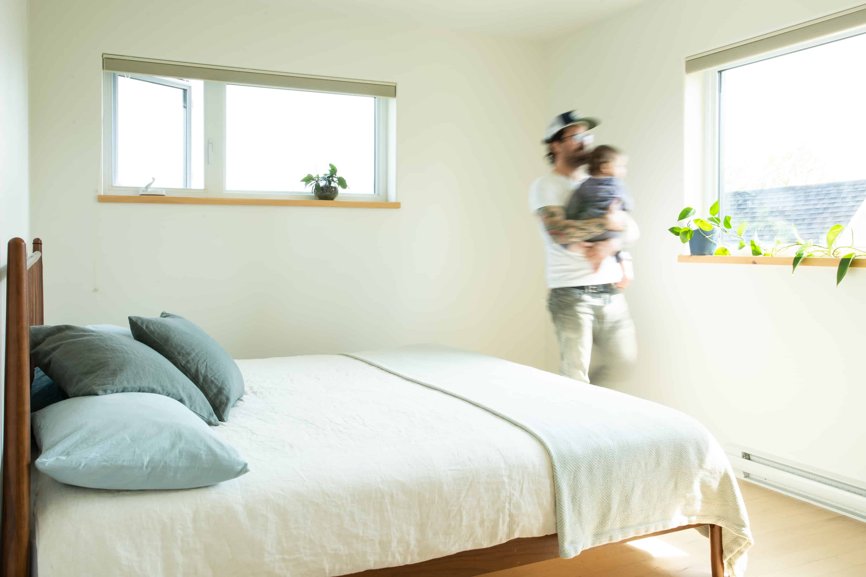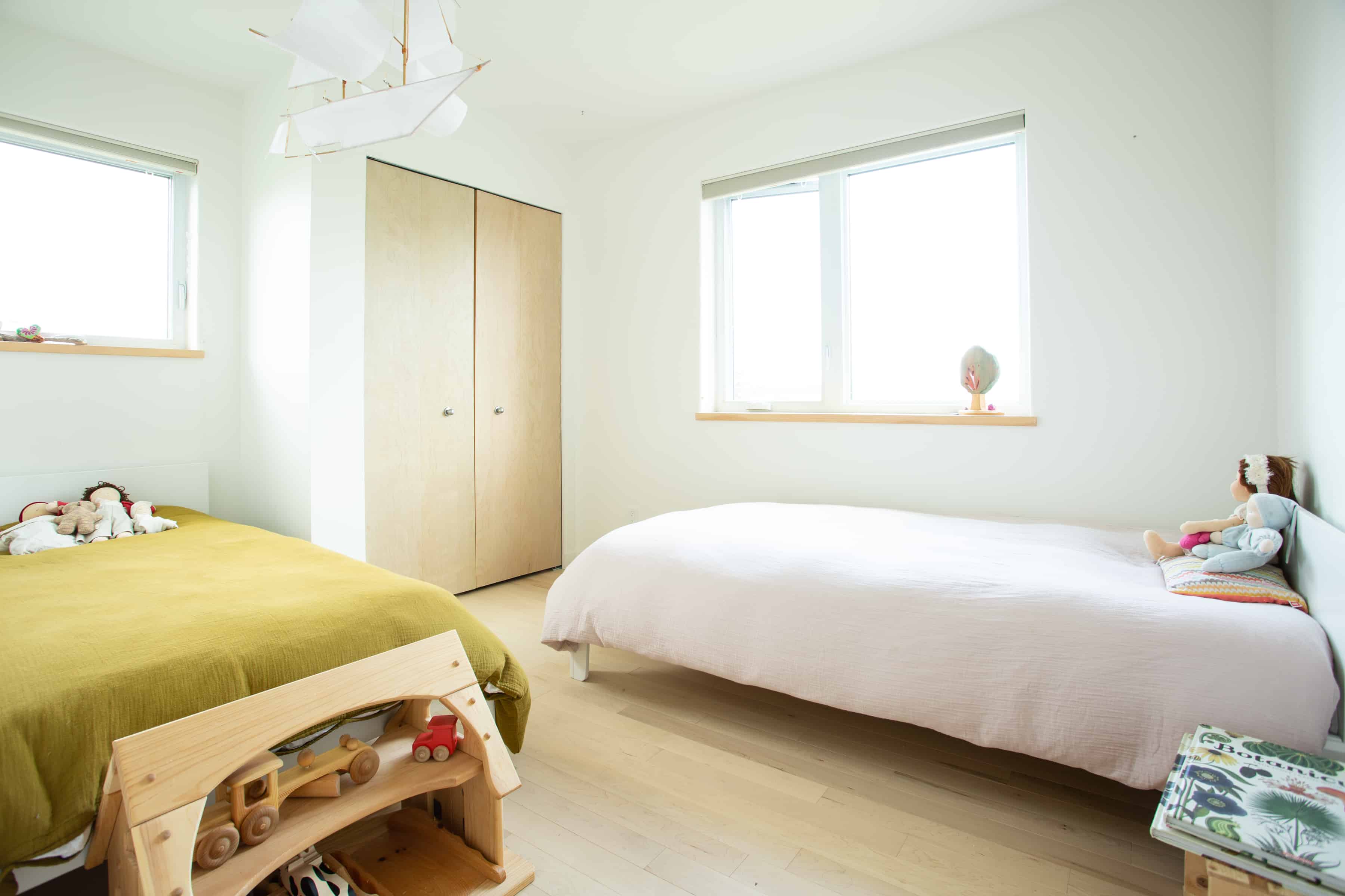 La disposition de la maison a été pensée avec soin tout en respectant le terrain et le pommier bien mature qui s’y trouvait. Les deux étages de la maison abritent trois chambres, deux salles de bain et une dalle de béton comme plancher chauffant afin de bien convenir au tout petit se promenant à quatre pattes. Le tout construit avec des matériaux nobles et dans une optique minimaliste et scandinave, nous pouvons retrouver plusieurs éléments qui rappellent cet esthétisme, dont les garde-corps des escaliers qui ont été dessinés et réalisés afin de convenir parfaitement à l’atmosphère de ce nid douillet. Pour accompagner le tout, la maison a une vue exceptionnelle sur un champ avec coucher de soleil, et ce à quelques minutes de la ville, dans un quartier résidentiel.