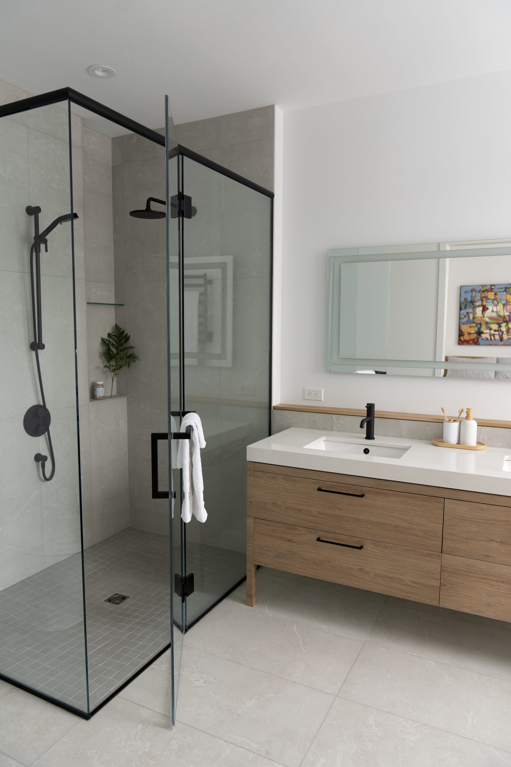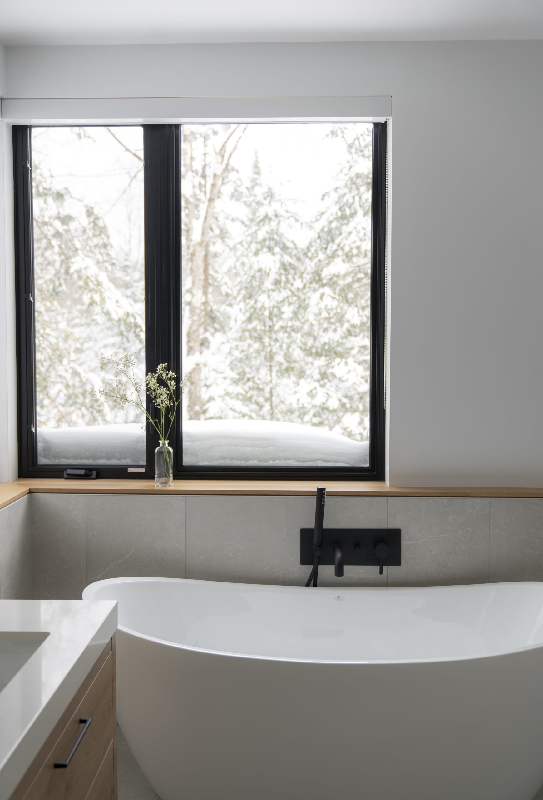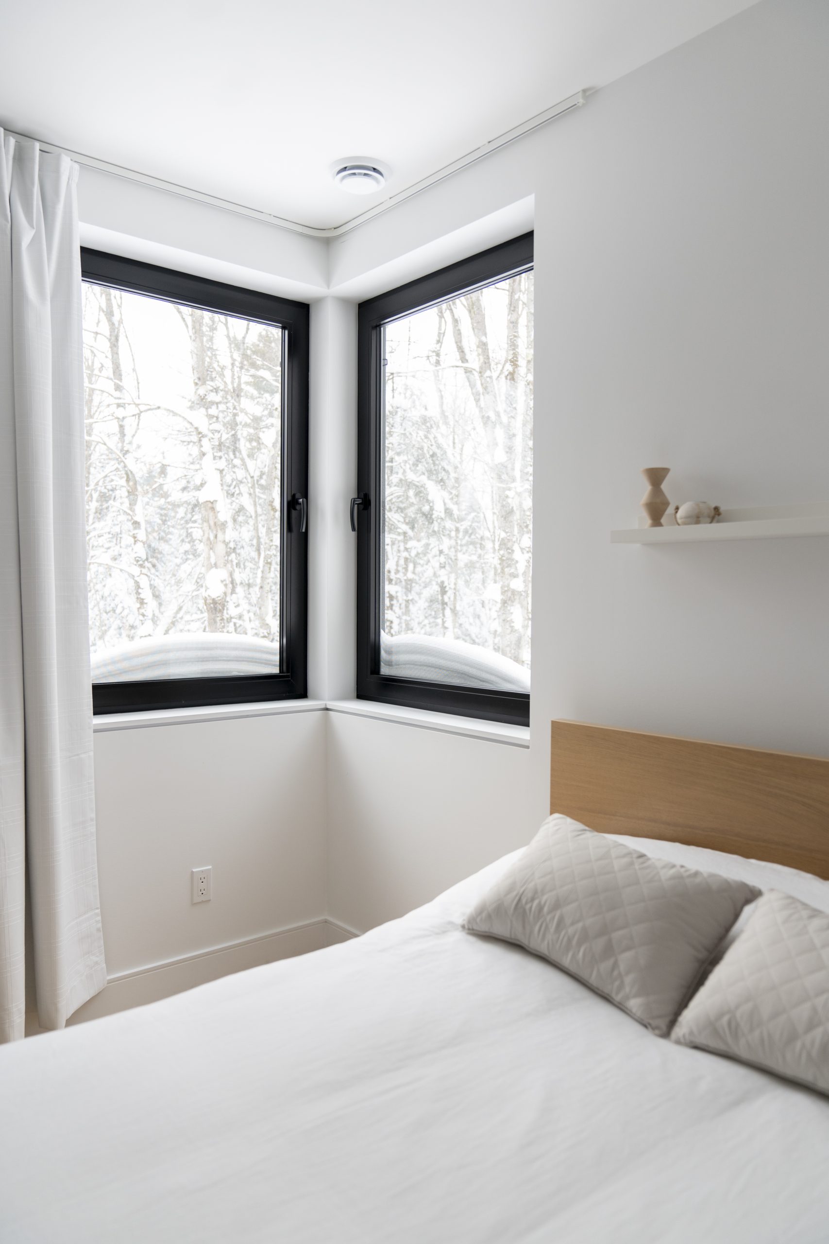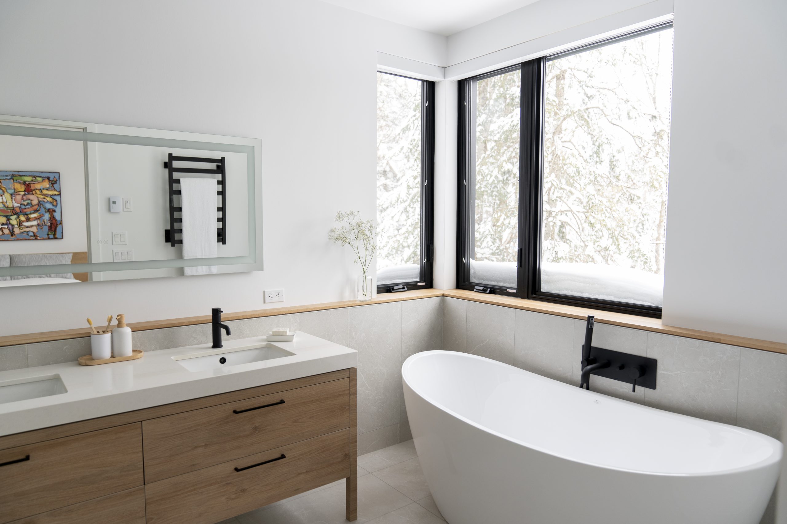 Dès l’entrée, l’attention portée aux détails se reflète dans des finitions de grande qualité et un design épuré. Le contraste des planchers de bois franc à l'étage et des planchers de béton au rez-de-chaussée ainsi que le choix des fenêtres plancher-plafond dans l'ensemble du rez-de-chaussée se fondent parfaitement au décor intemporel qui entoure la maison.