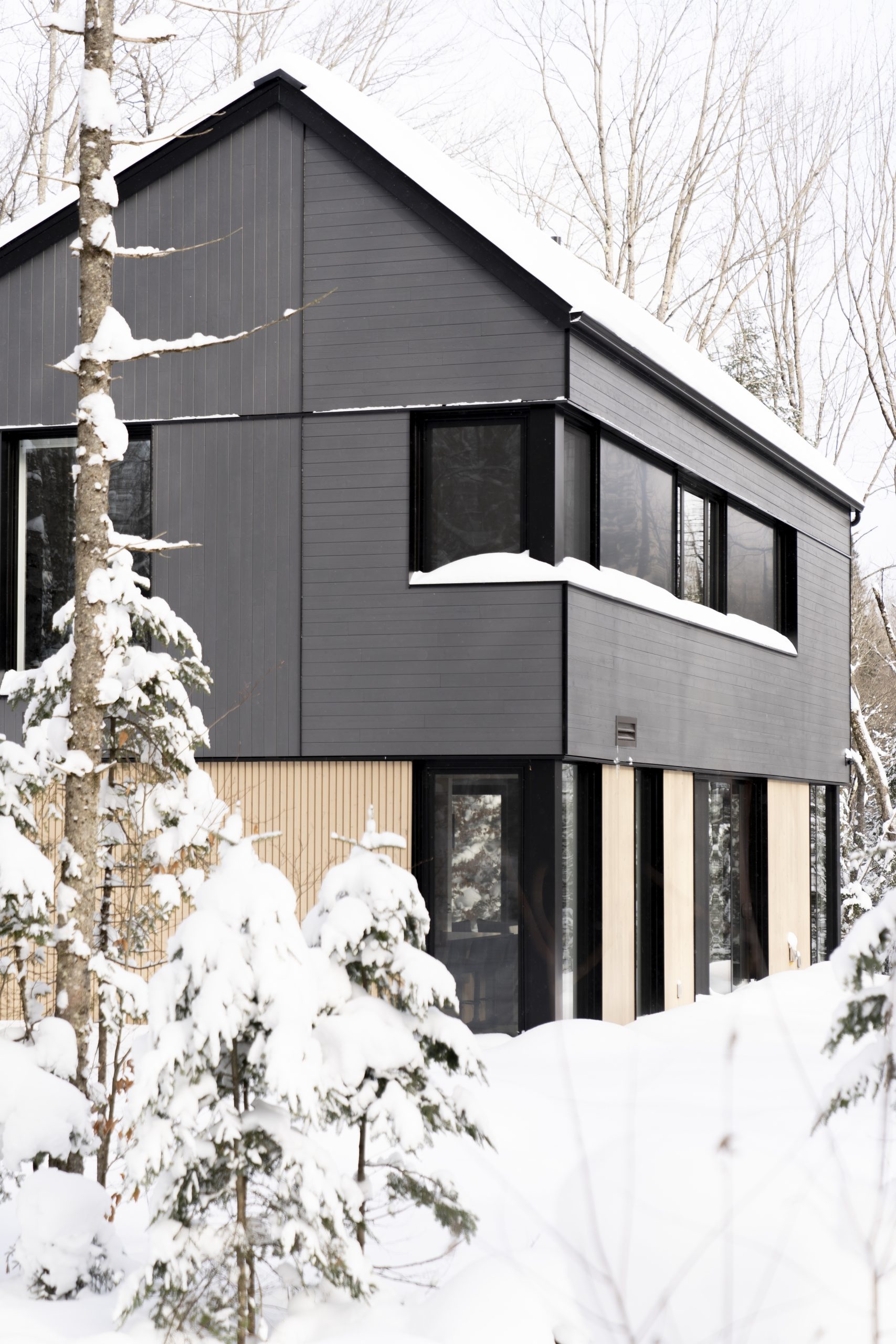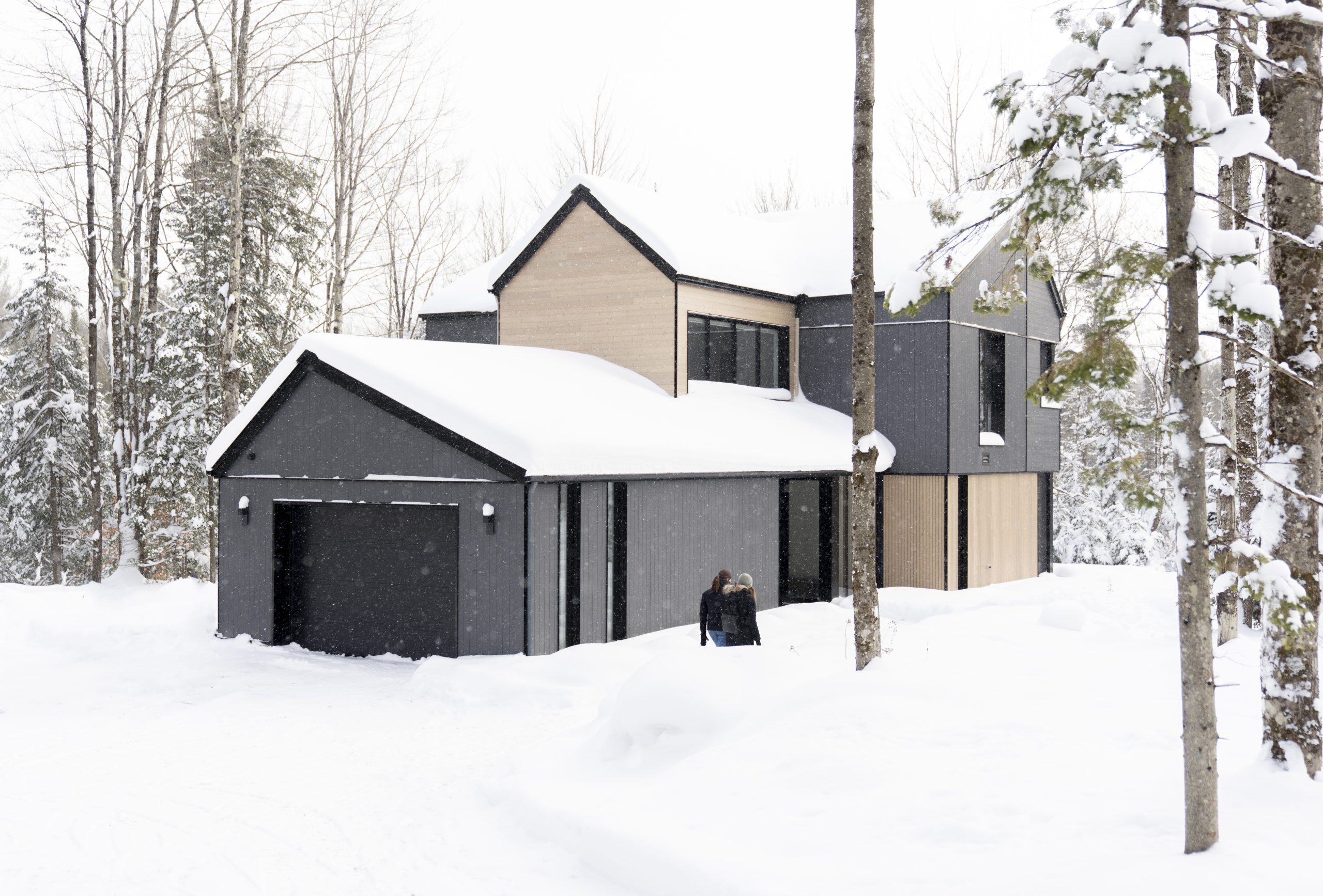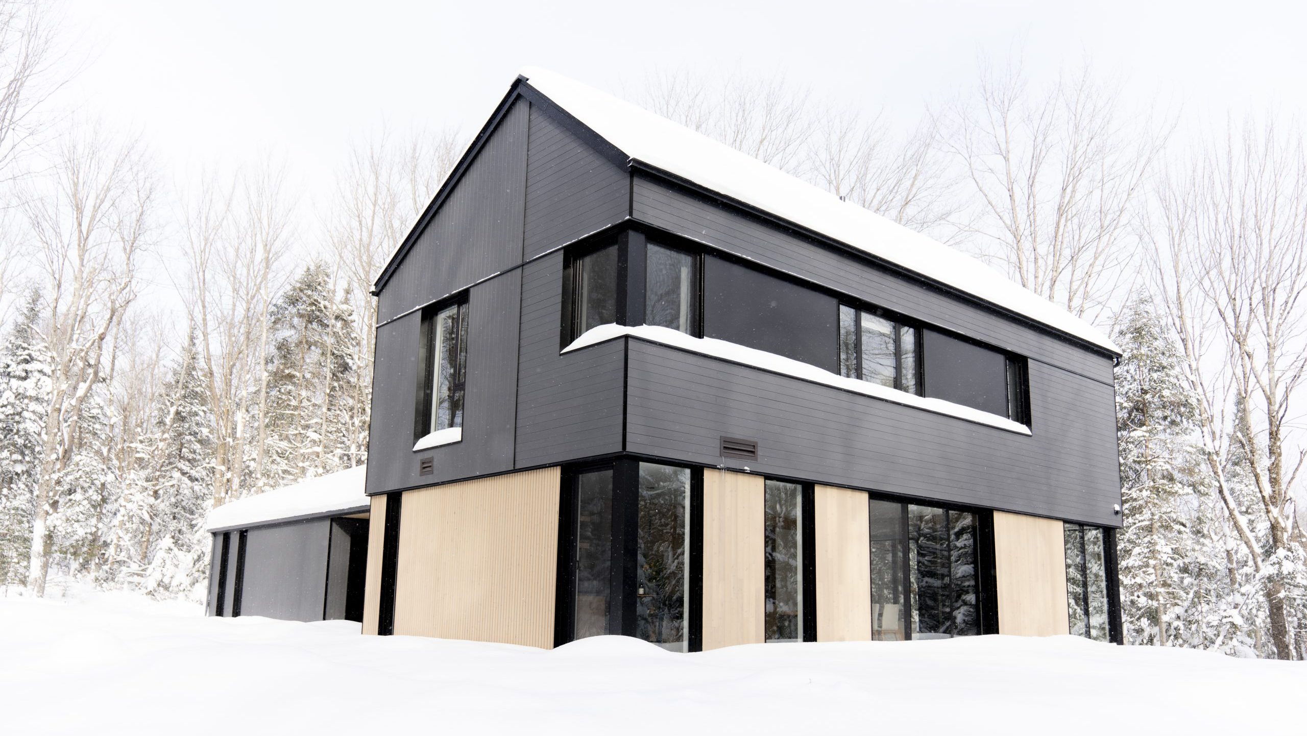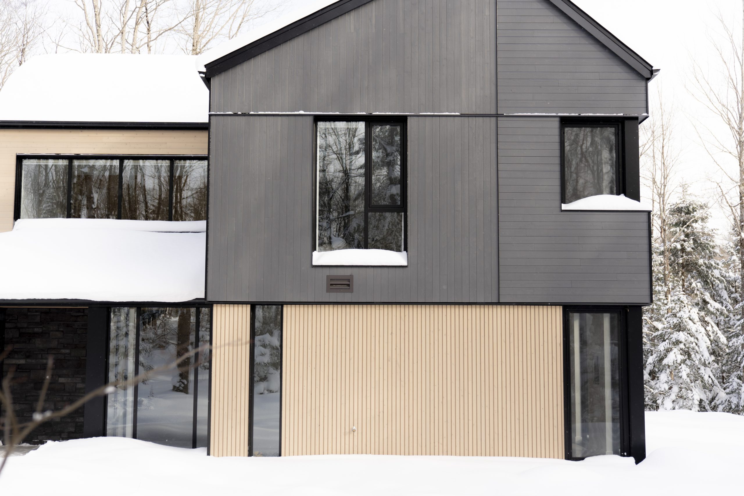 Recouverte de cinq revêtements extérieurs différents, la maison présente une architecture complexe, marquée par sa toiture, ses finitions intérieures soignées et sa façade presque entièrement vitrée.