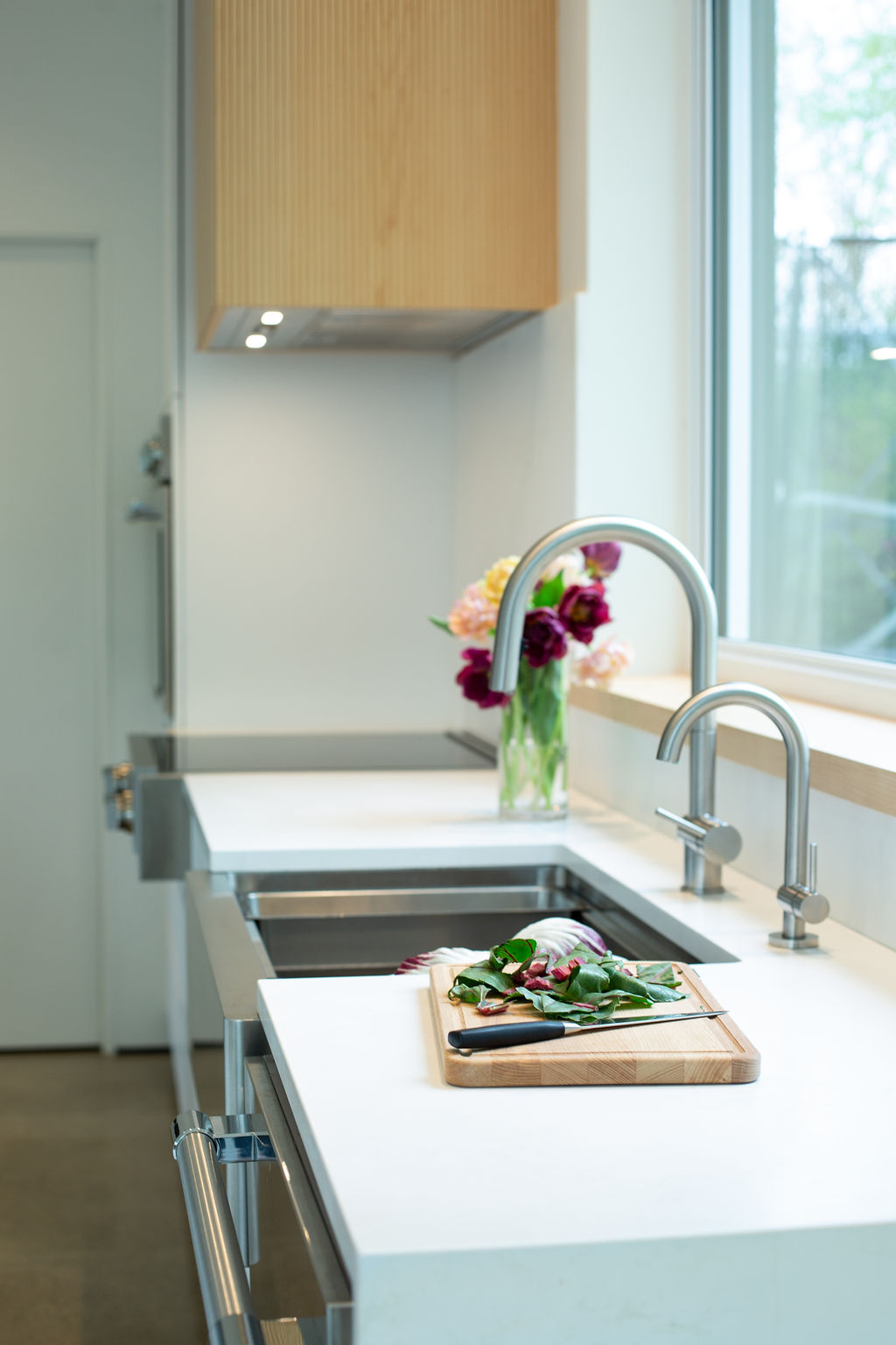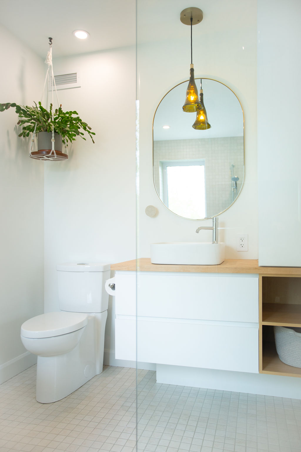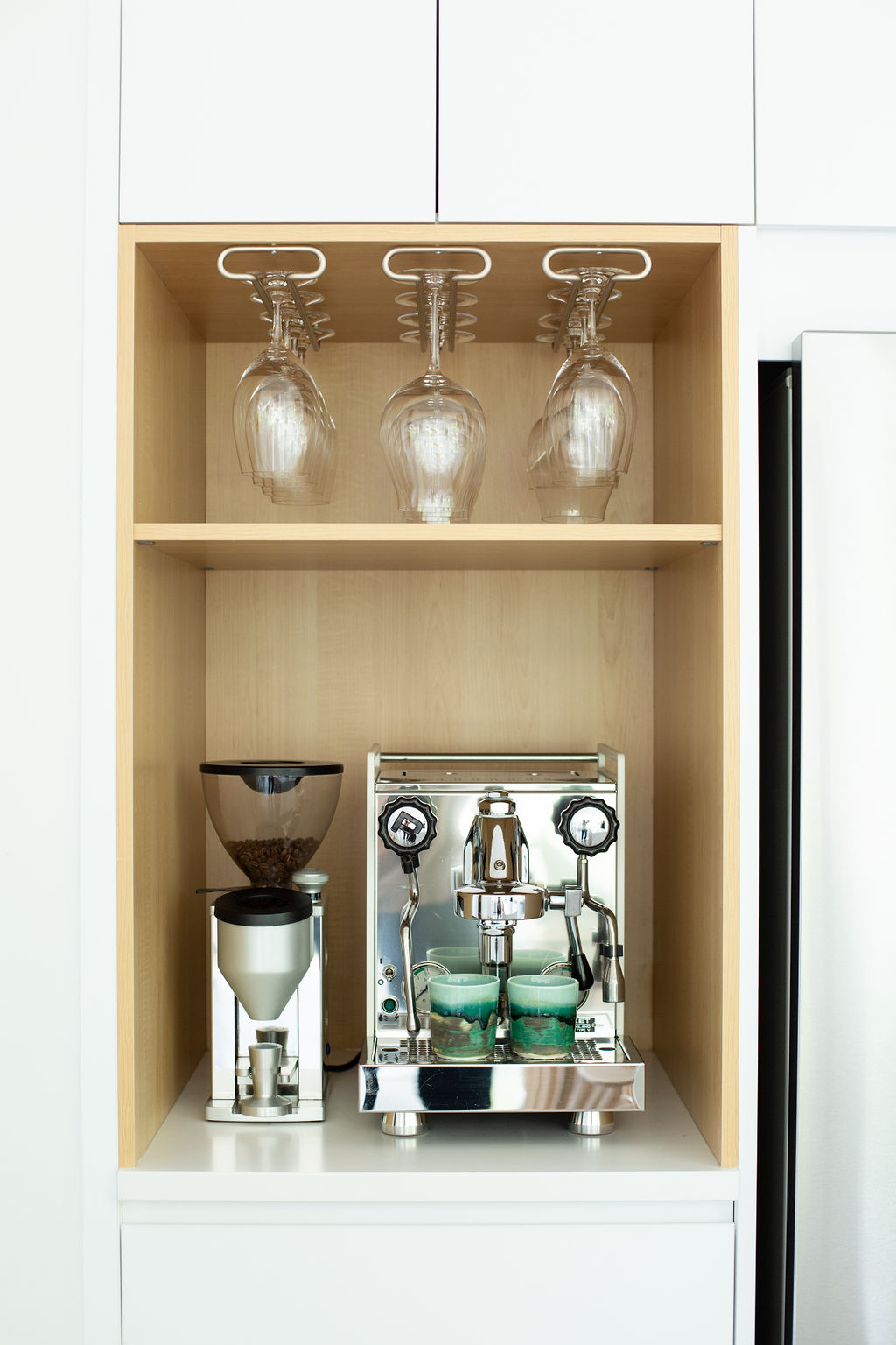 Cette maison, à la fois moderne et chaleureuse, est dotée de mobiliers intégrés ingénieux et de finitions en bois qui ajoutent de la chaleur et de la douceur au décor. Les murs sans moulures et les références subtiles à la passion et la profession vinicole de Madame, notamment à travers les luminaires, transforment cette maison en un endroit où l'on a envie d'être ; où l'on ressent l'âme et la chaleur de ses occupants.